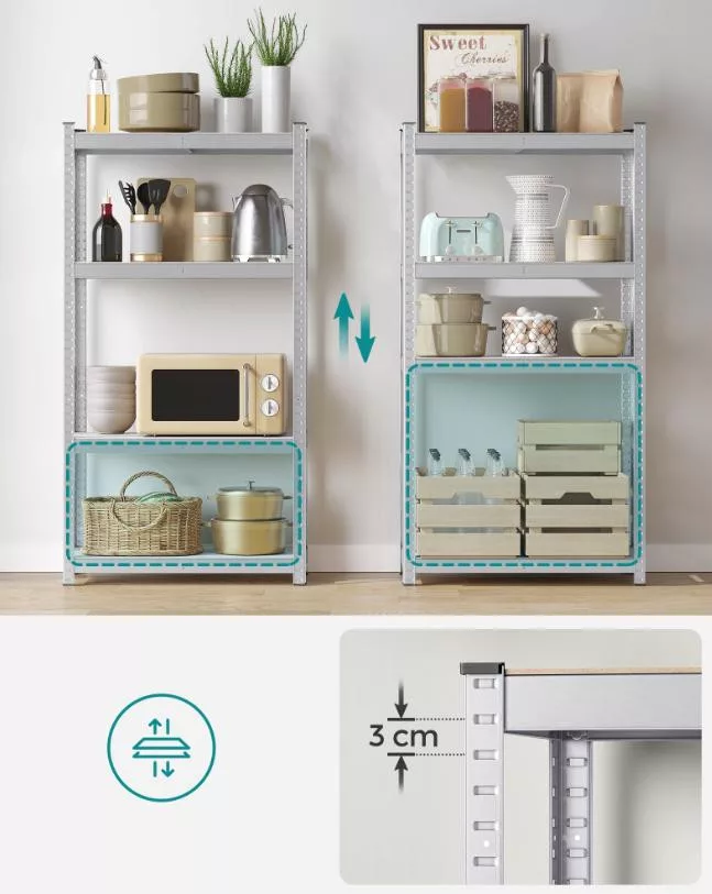 • Állítható polcmagasság 3 cm-es lépésekben: Tökéletesen igazítható a különböző méretű tárgyakhoz, maximalizálva a tárolási helyet
