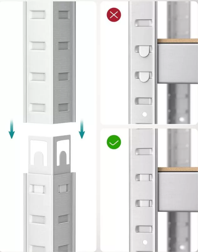 Az összeszerelés gyors és egyszerű, csavarok nélkül. A polcmagasság 3 cm-es lépésekben állítható, így könnyedén igazíthatja a teret az igényeihez. A megerősített kereszttartók növelik minden polc stabilitását és teherbírását, míg a védőlábsapkák megakadályozzák a padló karcolását és csökkentik a zajt. A porbevonatú acél konstrukció tartós és korrózióálló, így hosszú élettartamot biztosít még intenzív használat mellett is.