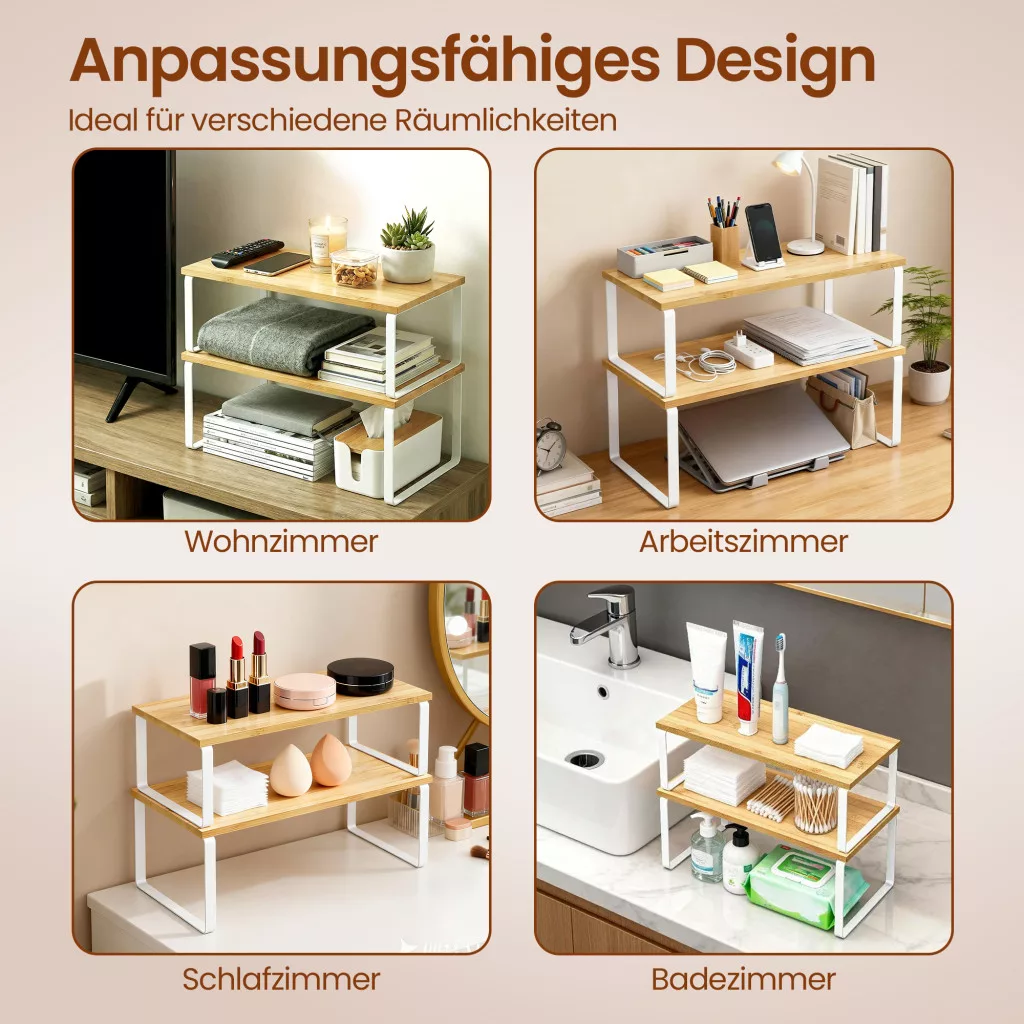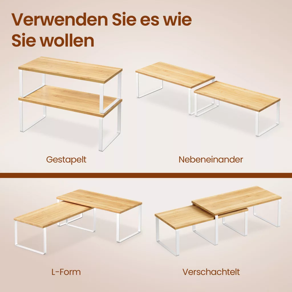 • Többféle elrendezési lehetőség: A két különböző méretű polc egymásra rakható, egymásba ágyazható, vagy külön-külön használható, így tökéletesen alkalmazkodik bármilyen térhez és tárolási igényhez