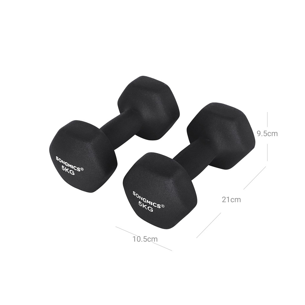 SONGMICS 2 db-os kézi súlyzó szett 2 x 5 kg neoprén bevonattal fekete hatszögletű csúszásmentes