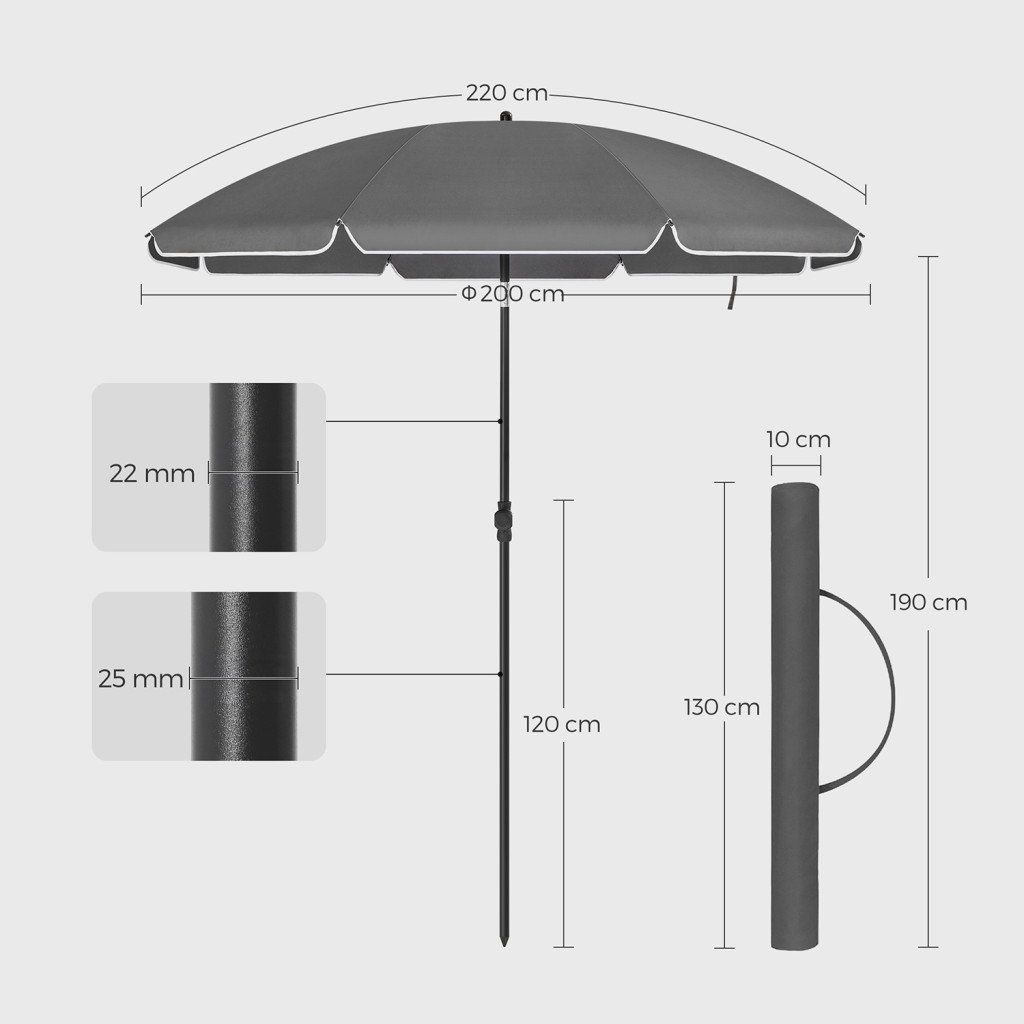 A cinkötvözet csukló segítségével könnyen állítható a napernyő dőlésszöge, így egész nap élvezheti az árnyékot. A kompakt méretűre összecsukható napernyő a mellékelt hordtáskában könnyen szállítható.