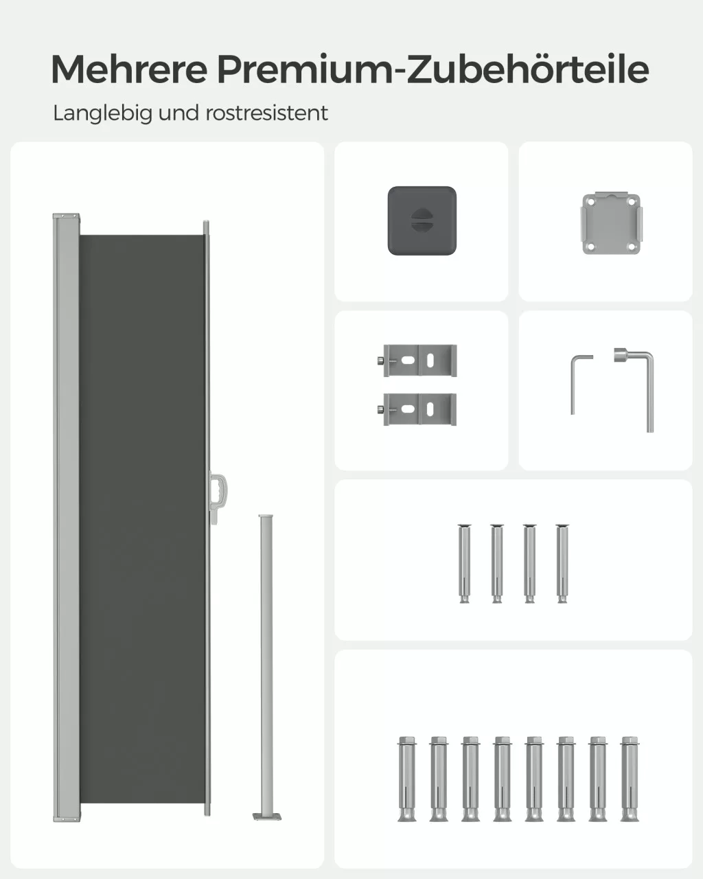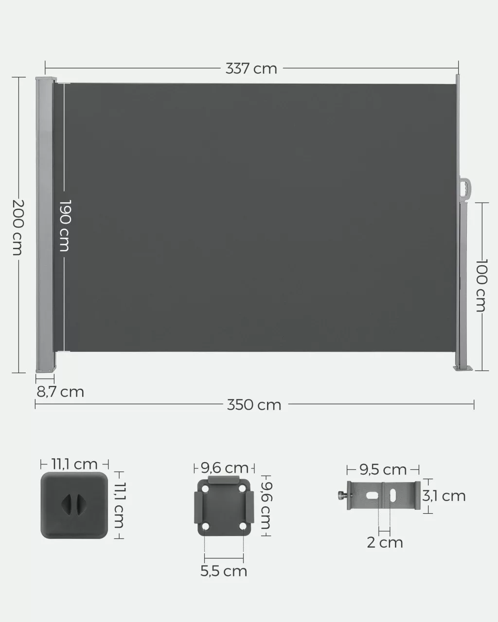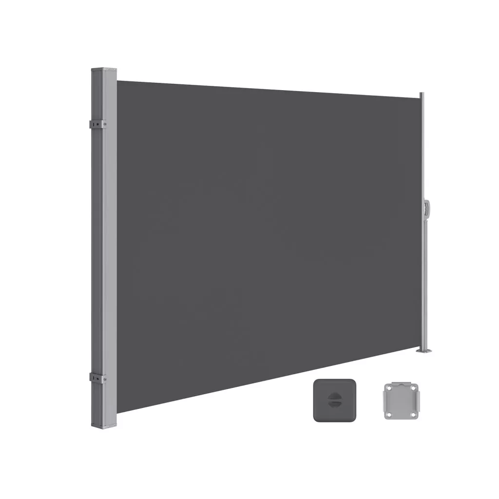 Ez a modern kialakítású oldalsó napellenző tökéletes megoldást kínál a terasz vagy erkély leárnyékolására. A 220 g/m² sűrűségű, PU bevonatú poliészter anyag tartós védelmet biztosít, míg a porbevonatos fém szerkezet garantálja a hosszú élettartamot.
