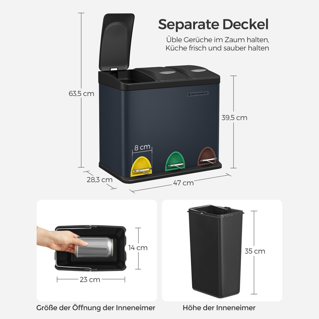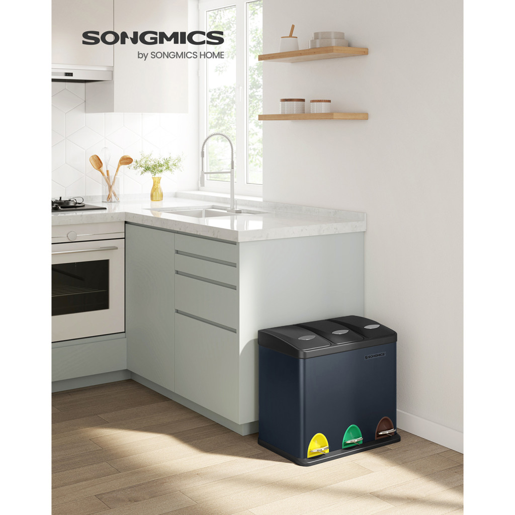 SONGMICS 3-Rekeszes Szelektív Hulladékgyűjtő Pedálos Szemetes 24L Acél Szürke