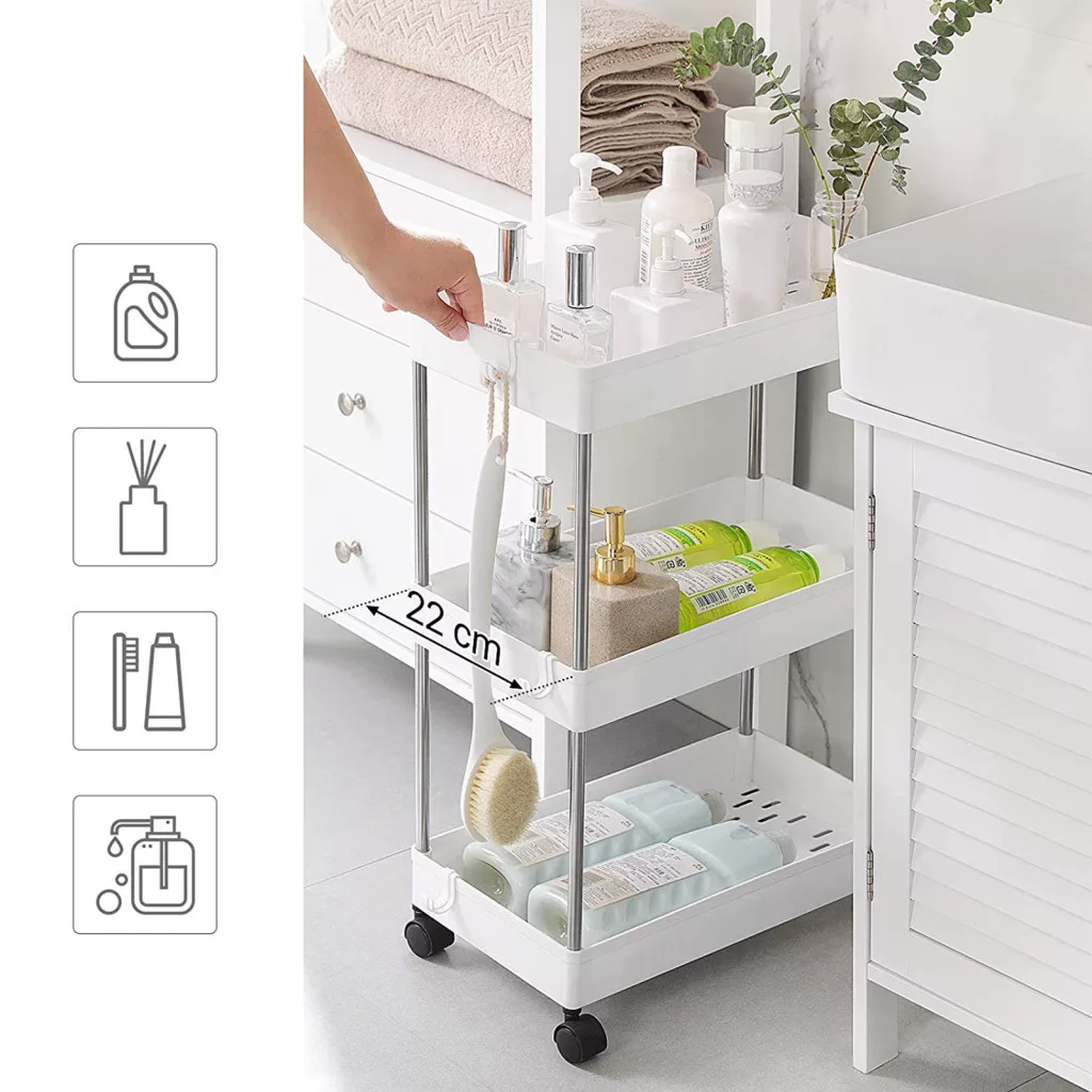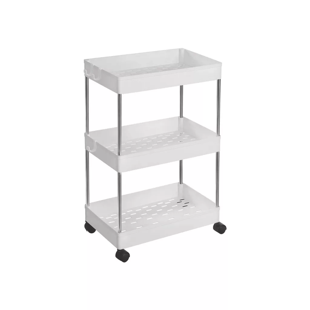 Kompakt, sokoldalú tárolókocsi 3 szinttel és görgőkkel, ideális konyhába, fürdőszobába vagy kis terekbe. Praktikus kialakításával és 15 kg teherbírásával tökéletes megoldást nyújt a mindennapi tárolási igényekhez.