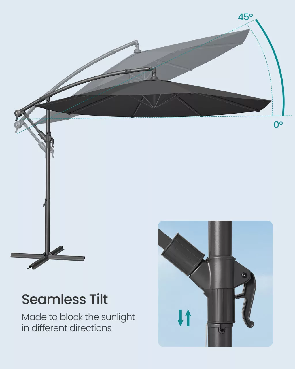 • Függő (cantilever) kialakítás: Az oldalsó rúdnak köszönhetően az árnyékolt terület teljesen szabadon használható, nincs középen zavaró oszlop