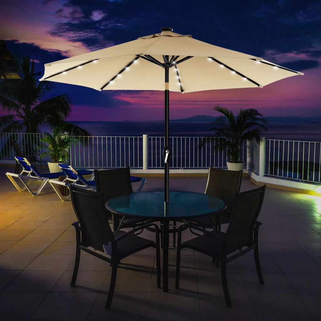 Elegáns, 3 méteres kerti napernyő 32 beépített LED világítással és UPF 50+ fényvédelemmel, amely tökéletes választás a kerti és teraszi pihenéshez.
