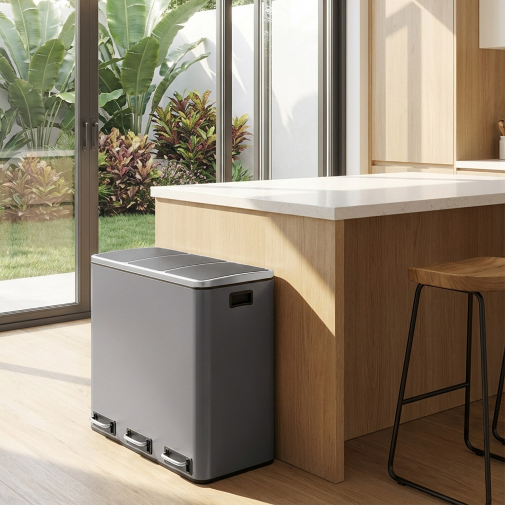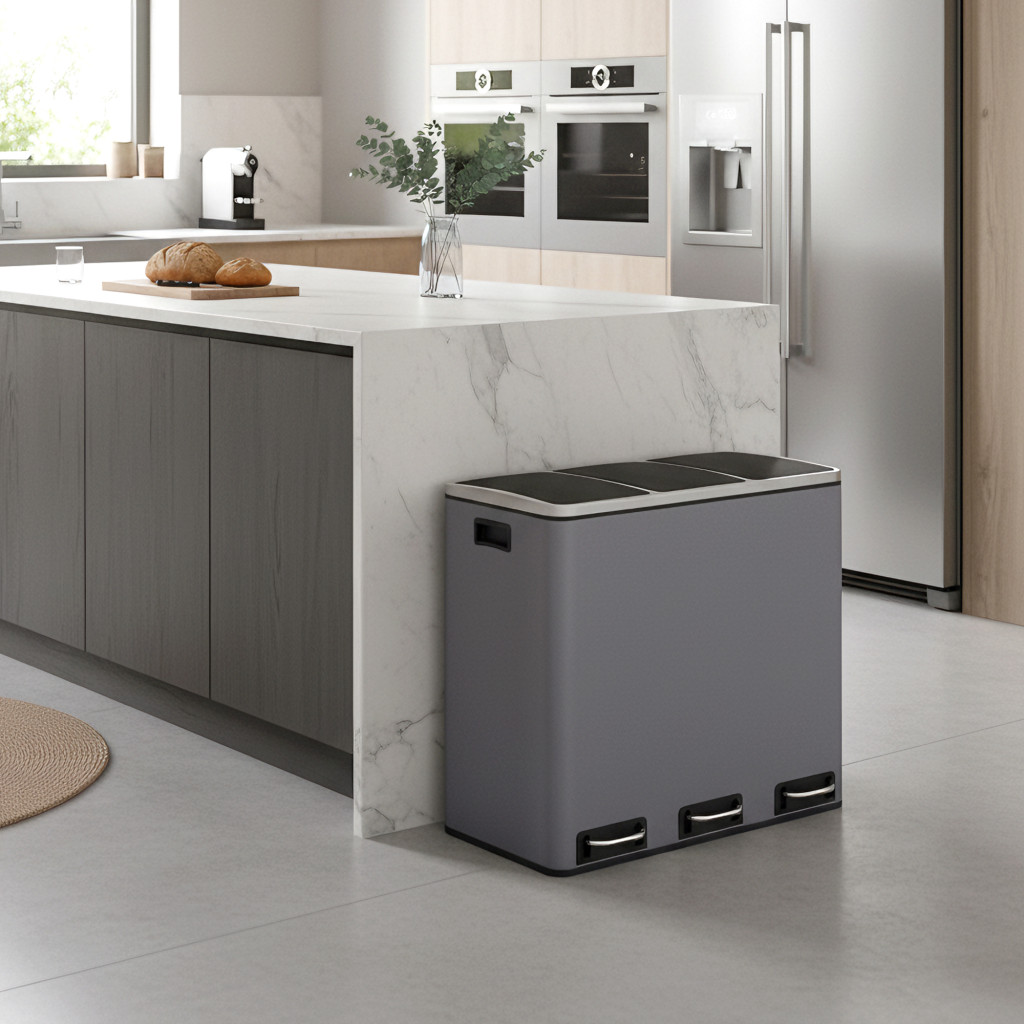 A SONGMICS 3 rekeszes pedálos szemeteskuka tökéletes megoldás a környezettudatos hulladékválogatáshoz. A matt szürke acél kialakítású kuka három 18 literes rekesszel, Softclose fedéllel és pedálos nyitással teszi egyszerűvé és higiénikusabbá a mindennapi hulladékkezelést.