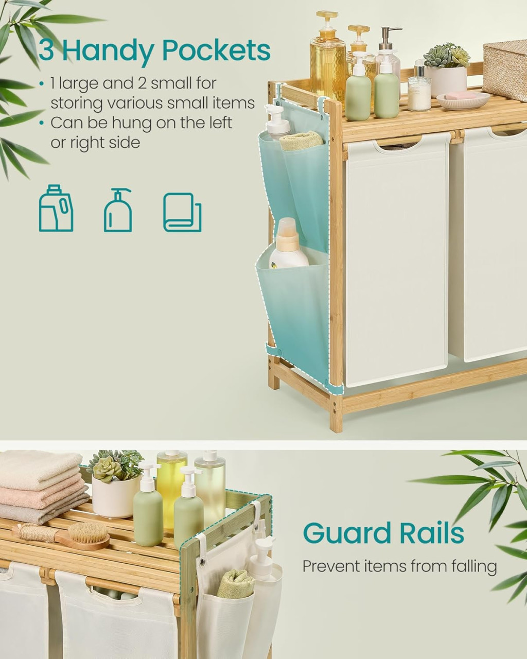 Ez a SONGMICS szennyestartó a tökéletes megoldás a mosás hatékony szervezéséhez. A három külön rekesznek köszönhetően könnyedén szétválogathatja a világos és sötét ruhákat, vagy akár anyagtípus szerint is csoportosíthatja őket. A prémium bambusz váz nemcsak stabil és tartós, hanem természetes eleganciát is kölcsönöz fürdőszobájának vagy mosókonyhájának.