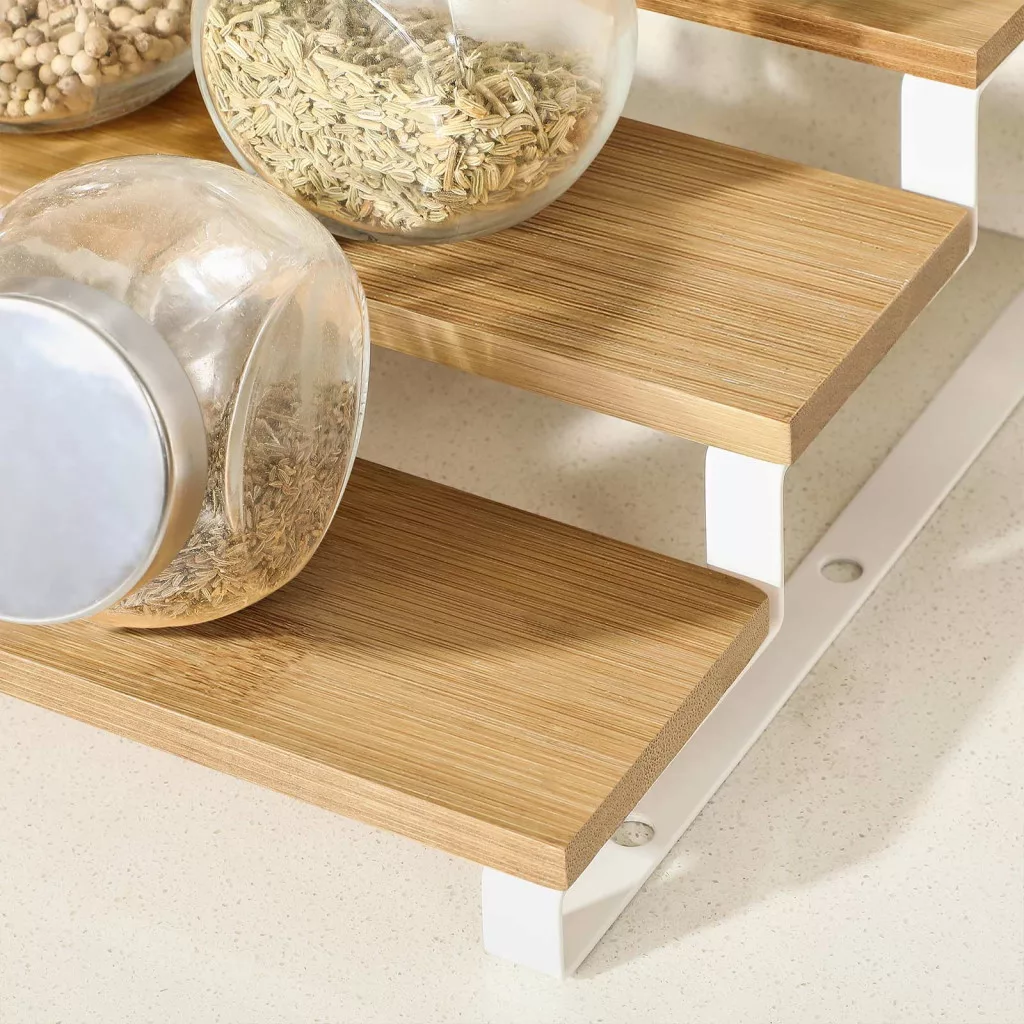 • 3-szintes lépcsőzetes kialakítás: Minden fűszerüveg jól látható és könnyen elérhető, így gyorsabban megtalálja a keresett fűszert főzés közben