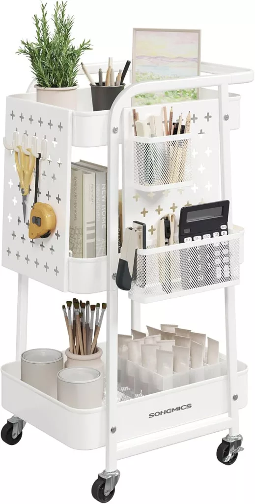 Sokoldalú, kompakt tárolókocsi 3 szinttel, levehető lyukacsos falakkal és praktikus akasztókkal, ideális otthoni és irodai rendszerezéshez.