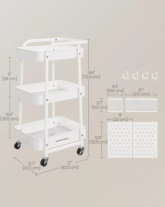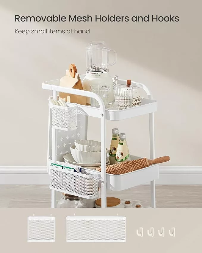 SONGMICS 3-szintes Tárolókocsi Fém Hálós Polcokkal Felhőfehér