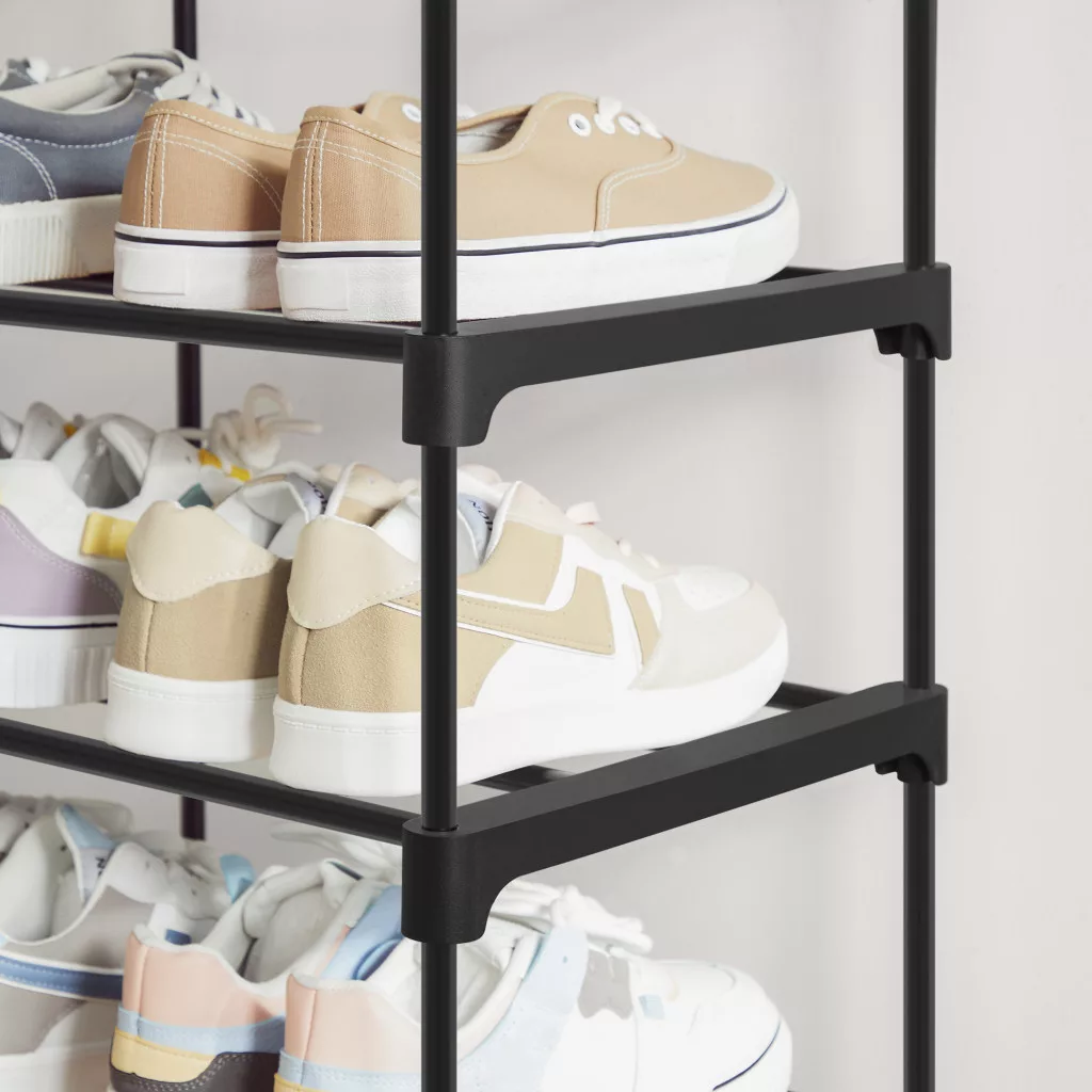 Ez a modern, fekete cipőtartó állvány a funkcionalitás és az elegancia tökéletes ötvözete. A három szintes kialakítás lehetővé teszi, hogy akár 12-15 pár cipőt rendezetten tároljon egyetlen állványon, így cipői mindig kéznél lesznek, amikor szüksége van rájuk. A nyitott polcos dizájn nemcsak könnyen áttekinthetővé teszi a cipőgyűjteményt, hanem segíti a szellőzést is, megakadályozva a kellemetlen szagok kialakulását.