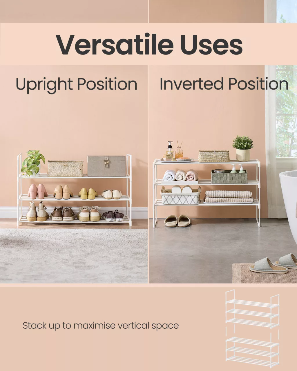 Az állvány igazi erőssége a sokoldalúságában rejlik: használhatja hagyományos álló helyzetben, fordítsa meg extra tárolóhely nyeréséhez, vagy akár rakjon egymásra két állványt a függőleges tér maximális kihasználásához. A minőségi fémcsövek és műanyag csatlakozók stabil szerkezetet biztosítanak, minden polc 10 kg terhelést bír el. A sima felületnek köszönhetően a tisztítás gyerekjáték, egyszerűen áttörölhető egy nedves kendővel.