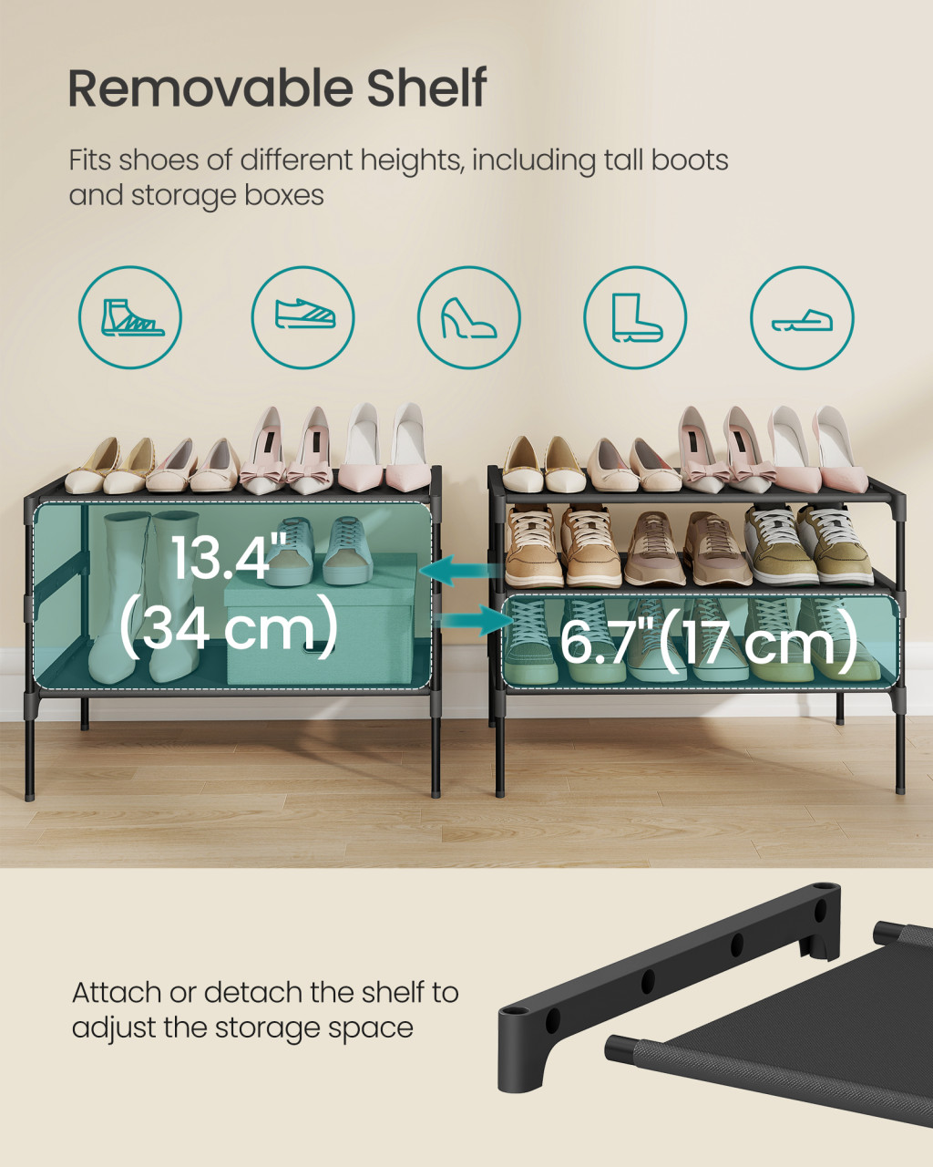 • Rugalmas használat: Egymásra helyezhető a függőleges tér kihasználásához, vagy polc eltávolításával magasabb lábbelik tárolására is alkalmas