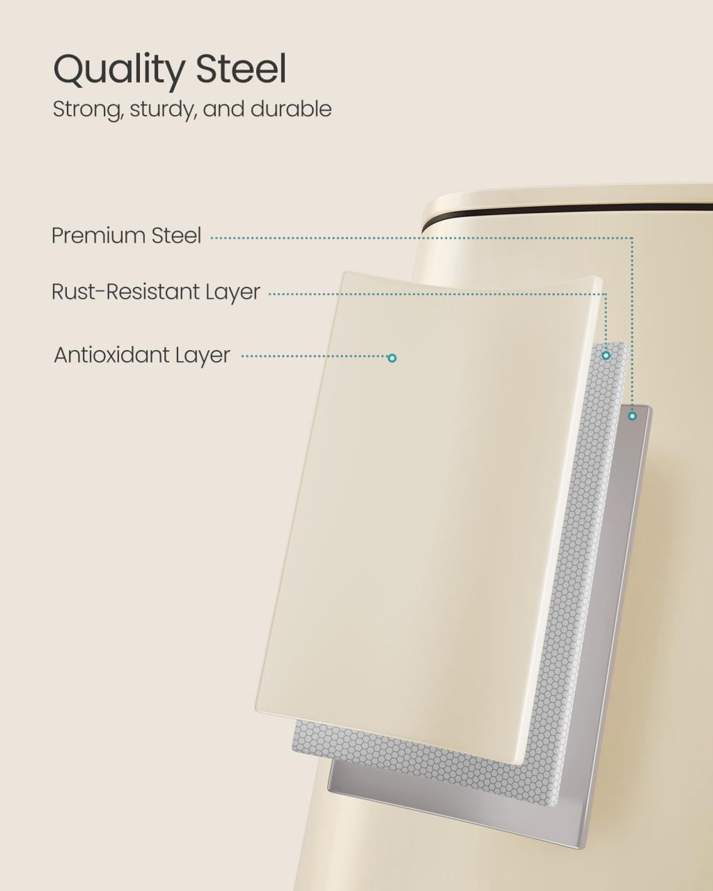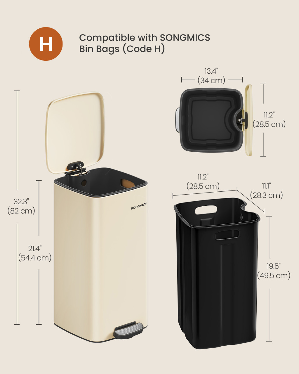 A SONGMICS 30 literes pedálos szemeteskuka a funkcionalitás és az elegáns dizájn tökéletes ötvözete. A homokbézs színű acél kuka kompakt méretével ideális kisebb konyhákba és helyiségekbe, miközben elegendő kapacitást biztosít a mindennapi hulladékkezeléshez. A lágy záródású fedél csendesen zár, megakadályozva a kellemetlen zajokat és bezárva a szagokat, míg a nyitva tartó funkció megkönnyíti a hulladék elhelyezését forgalmasabb időszakokban.