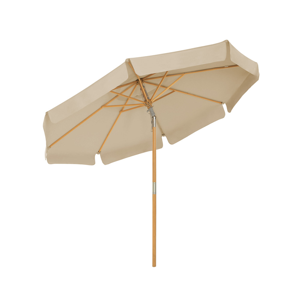Ez a 300 cm átmérőjű napernyő tökéletes megoldást kínál a nyári napsütés elleni védekezésre. A természetes bükkfa rúd és a 8 tartós borda nem csak stabilitást biztosít, de elegáns megjelenést is kölcsönöz a terasznak vagy kertnek. A 180 g/m² vastagságú poliészter anyag hatékony védelmet nyújt az UV-sugárzás ellen.