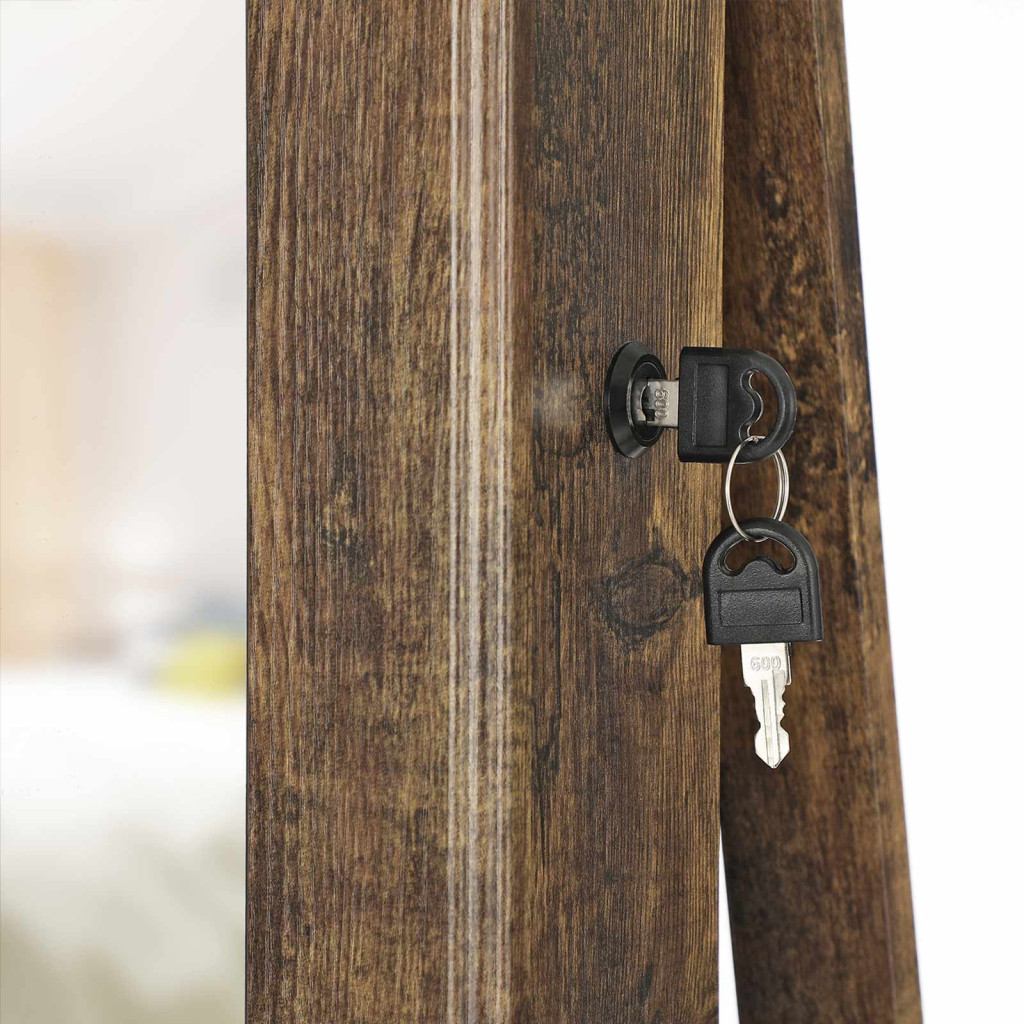 Elegáns, rusztikus barna ékszertartó szekrény beépített teljes alakos tükörrel és 360°-ban forgatható talppal, amely tökéletes megoldást nyújt ékszerei rendszerezett tárolására.