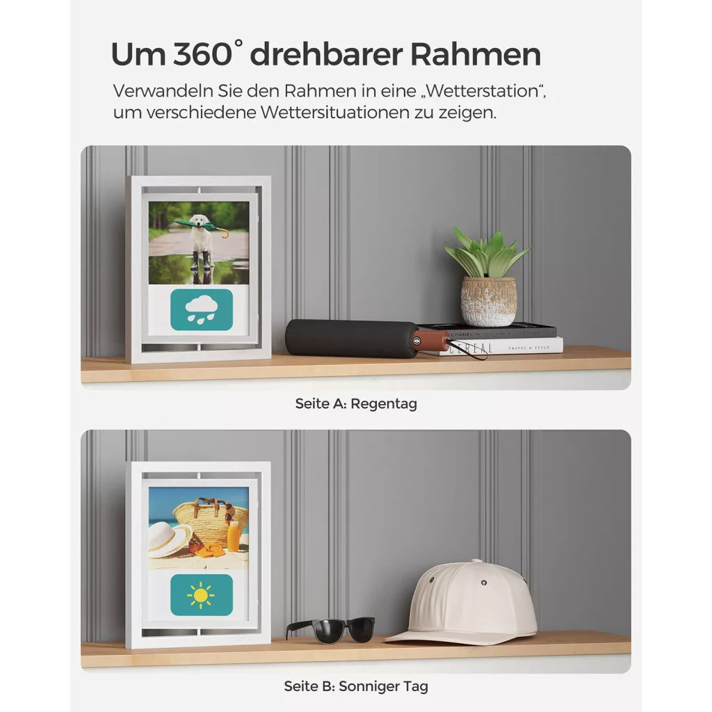 Ez az elegáns fehér képkeret szett forradalmasítja a fotók megjelenítését. A 360 fokban forgatható kialakítás lehetővé teszi két kép egyidejű bemutatását ugyanabban a keretben, míg a két üveglap között biztonságosan védve maradnak kedvenc fotói.