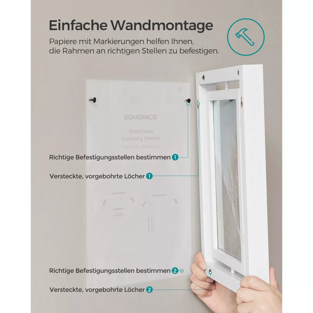A keretek többféle módon használhatók: állíthatók vagy falra szerelhetők, horizontálisan vagy vertikálisan. A minőségi MDF anyag és az edzett üveglapok tartósságot és biztonságot garantálnak, miközben a letisztult fehér dizájn tökéletesen illeszkedik bármilyen belső térhez.