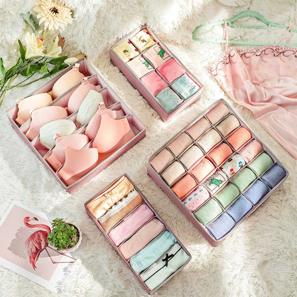 Praktikus fiókrendező szett melltartók, alsóneműk, nyakkendők és zoknik rendszerezett tárolásához, tartós nem szőtt anyagból, rózsaszín kivitelben.