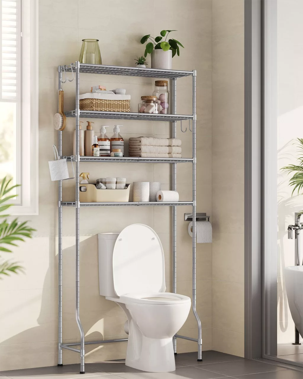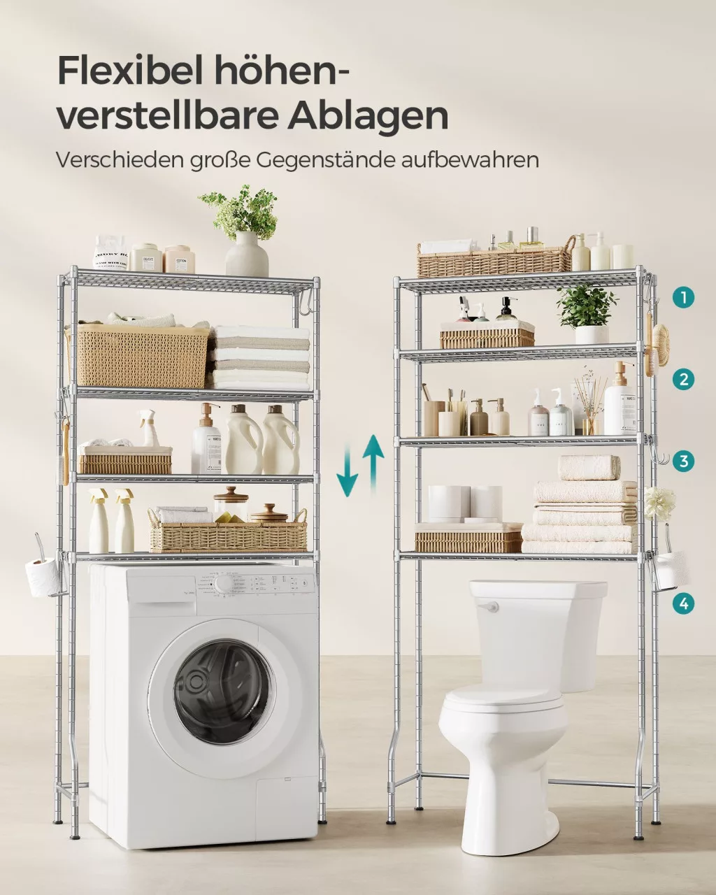 Praktikus, 4 szintes fürdőszobai tárolóállvány WC vagy mosógép fölé, állítható polcmagassággal és hasznos kiegészítőkkel a rendezett fürdőszobáért.