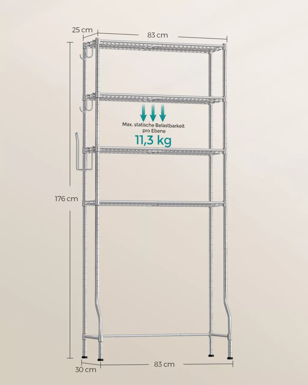 Ez a sokoldalú fürdőszobai állvány tökéletes megoldást nyújt a helykihasználásra a WC vagy mosógép feletti tér hasznosításával. A 4 állítható magasságú polc, a beépített WC-papír tartó és a 4 praktikus akasztó segítségével minden fürdőszobai kellék rendezett helyet kap.