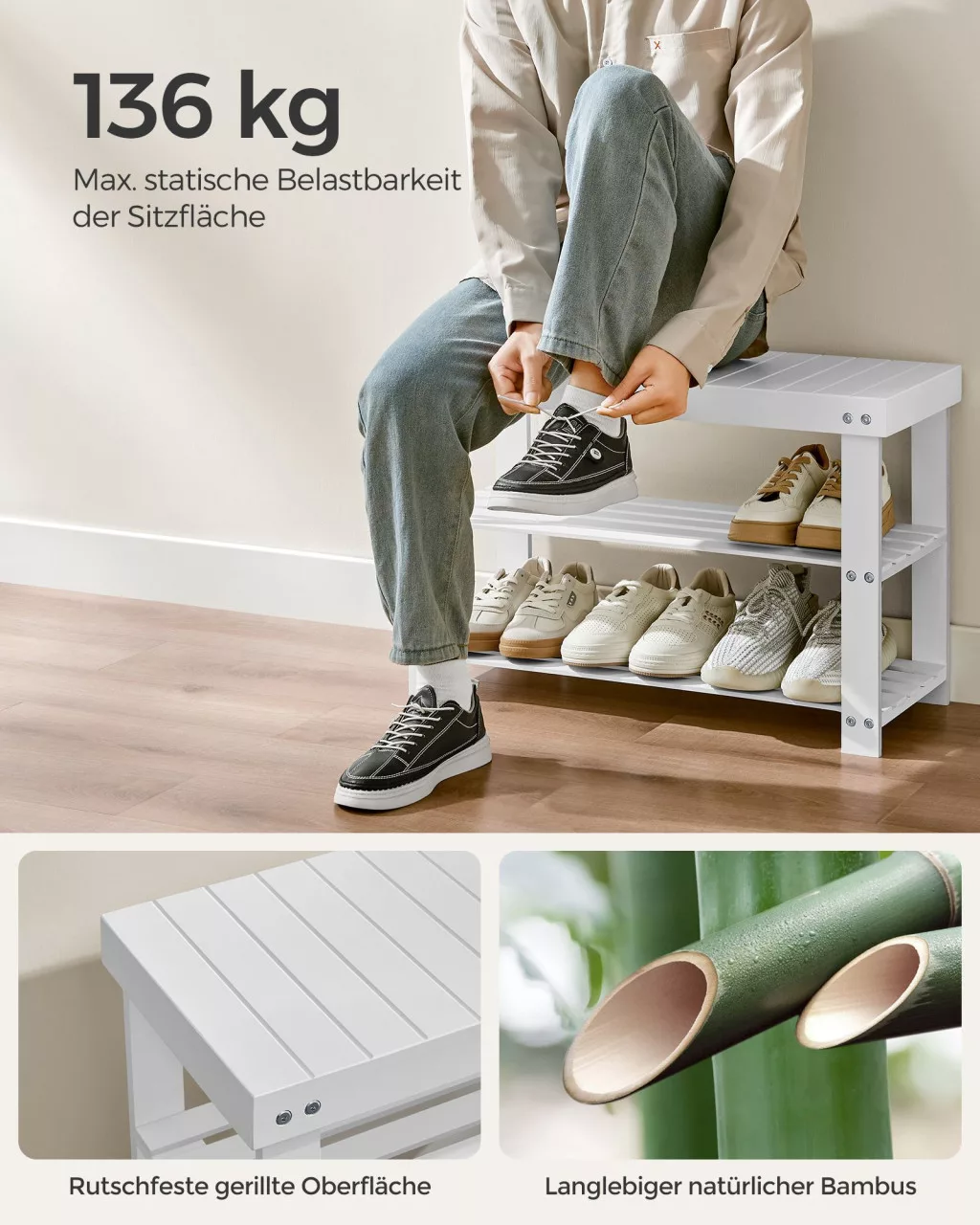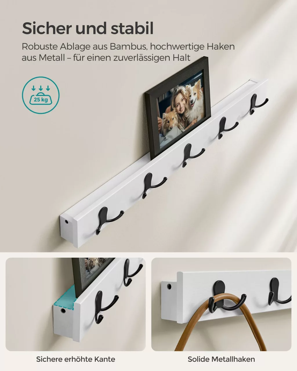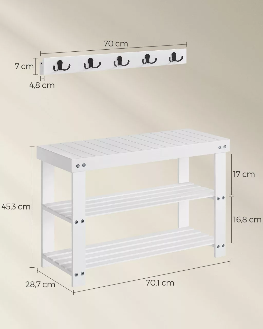 A robusztus szerkezetű állvány két tágas polcával elegendő helyet biztosít cipők, táskák és egyéb kiegészítők tárolására, míg a felső része kényelmes ülőfelületként szolgál. Az 5 dupla akasztóval ellátott fali sín pedig ideális kabátok, sálak és kalapok rendezett tárolására.