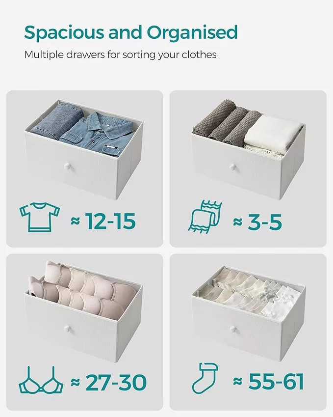 • 4 tágas textil fiók: Bőséges tárolókapacitás ruházathoz, fehérneműhöz és apróságokhoz - minden fiók akár 3 kg terhelést is elbír