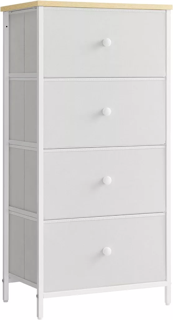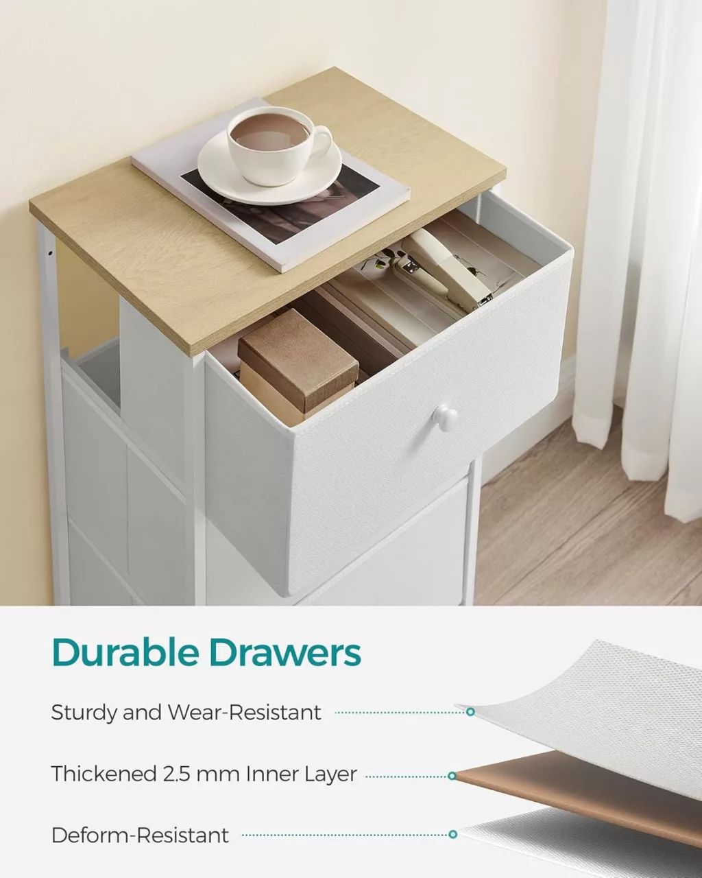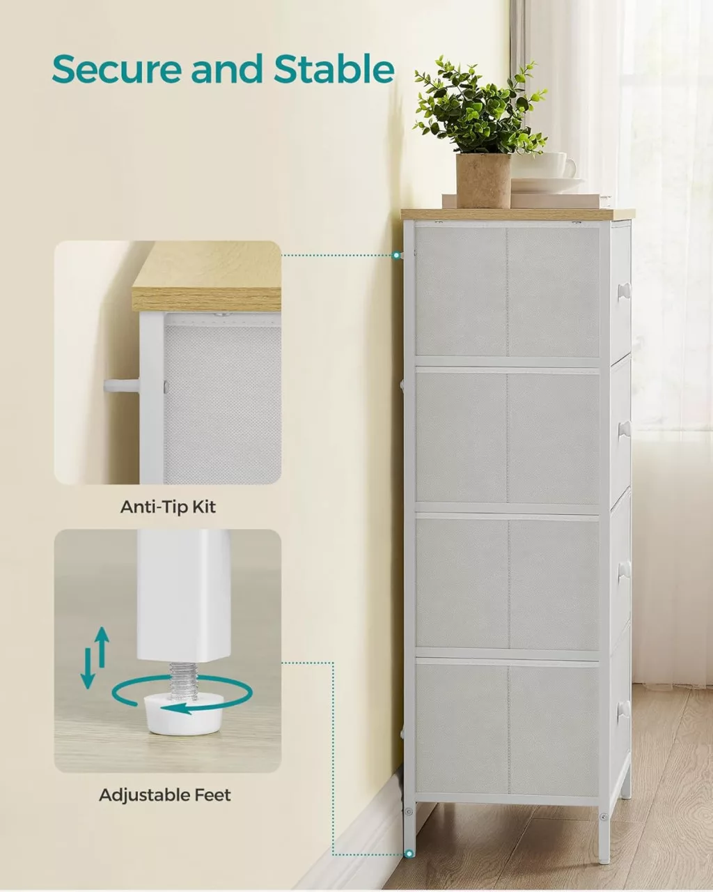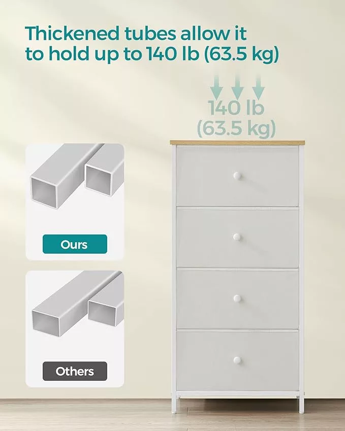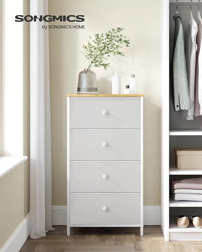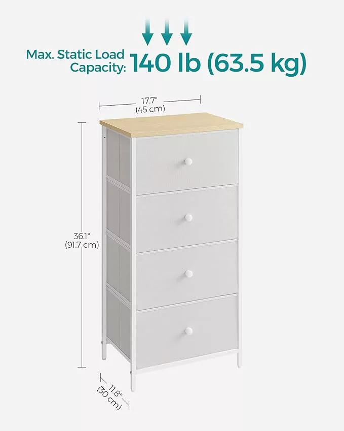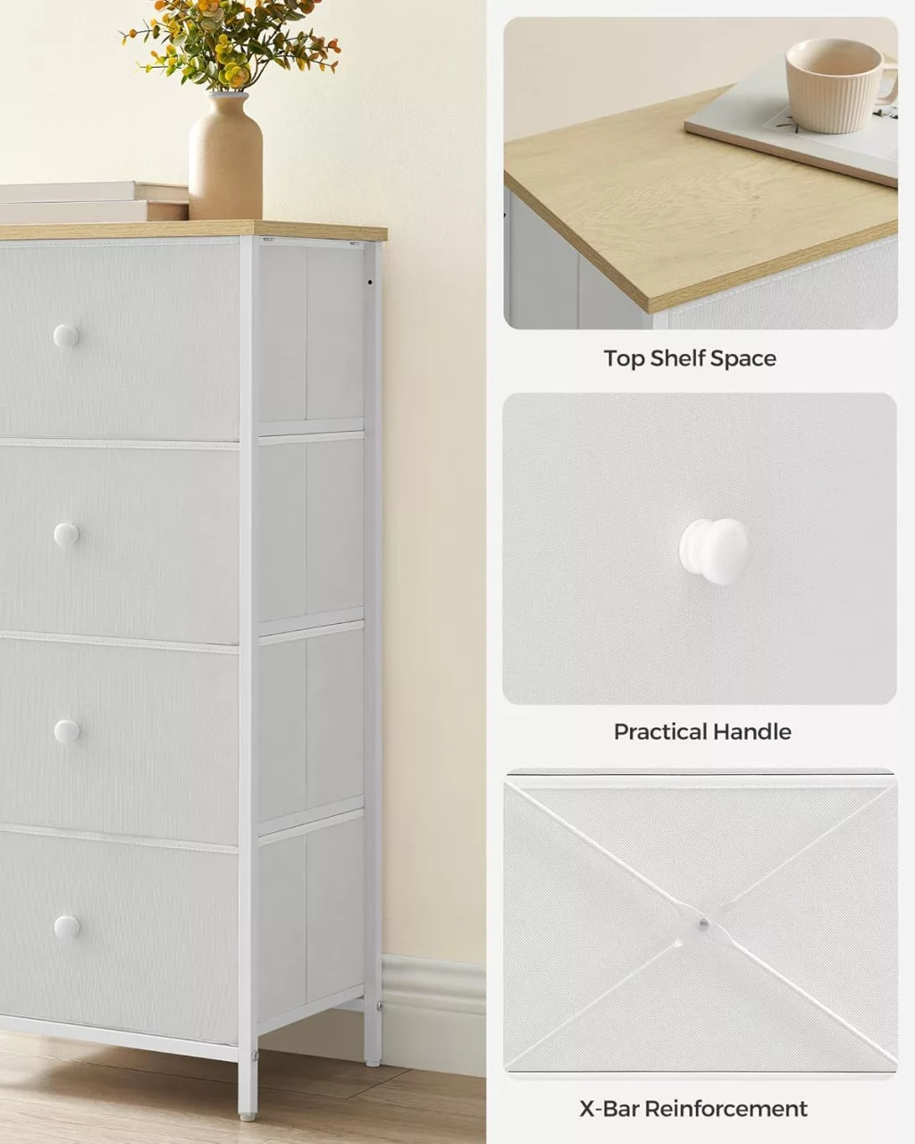 A SONGMICS 4 fiókos komód tökéletes választás azok számára, akik funkcionalitást és esztétikát egyaránt keresnek. A karcsú, magas kialakítás minimális helyet foglal, miközben bőséges tárolókapacitást biztosít. A fehér textil fiókok és a tölgy színű felső lap harmonikus kontrasztja modern, skandináv hangulatot teremt bármely helyiségben. A stabil fém váz és a minőségi forgácslap felső rész hosszú élettartamot garantál.