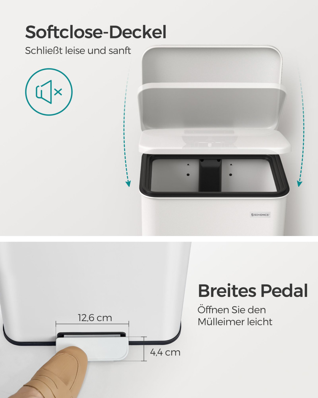SONGMICS 40 Literes Acél Pedálos Szemetes Soft-Close Fedéllel Fehér