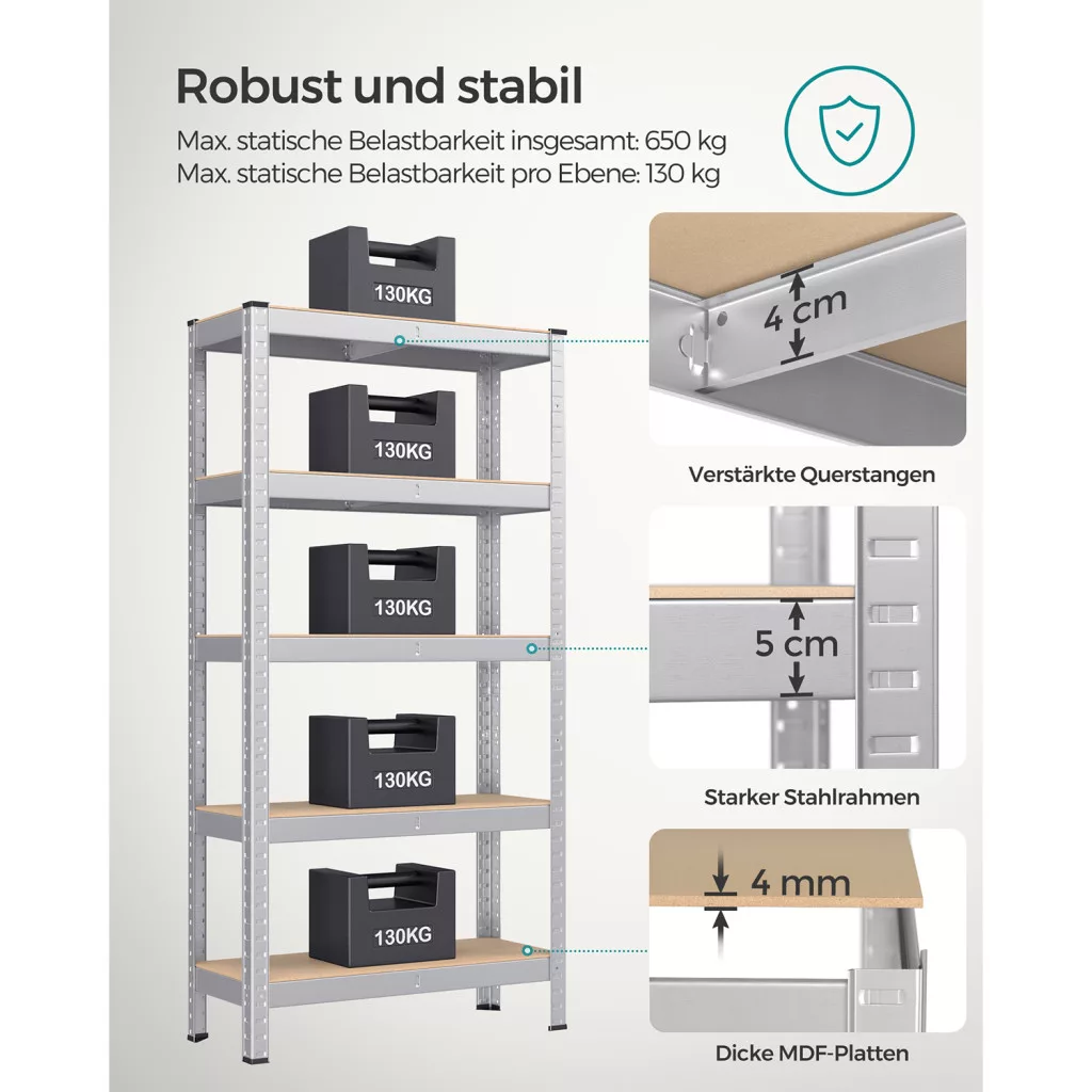 • Nagy teherbírás: Szintenként 130 kg, összesen 650 kg terhelhetőség