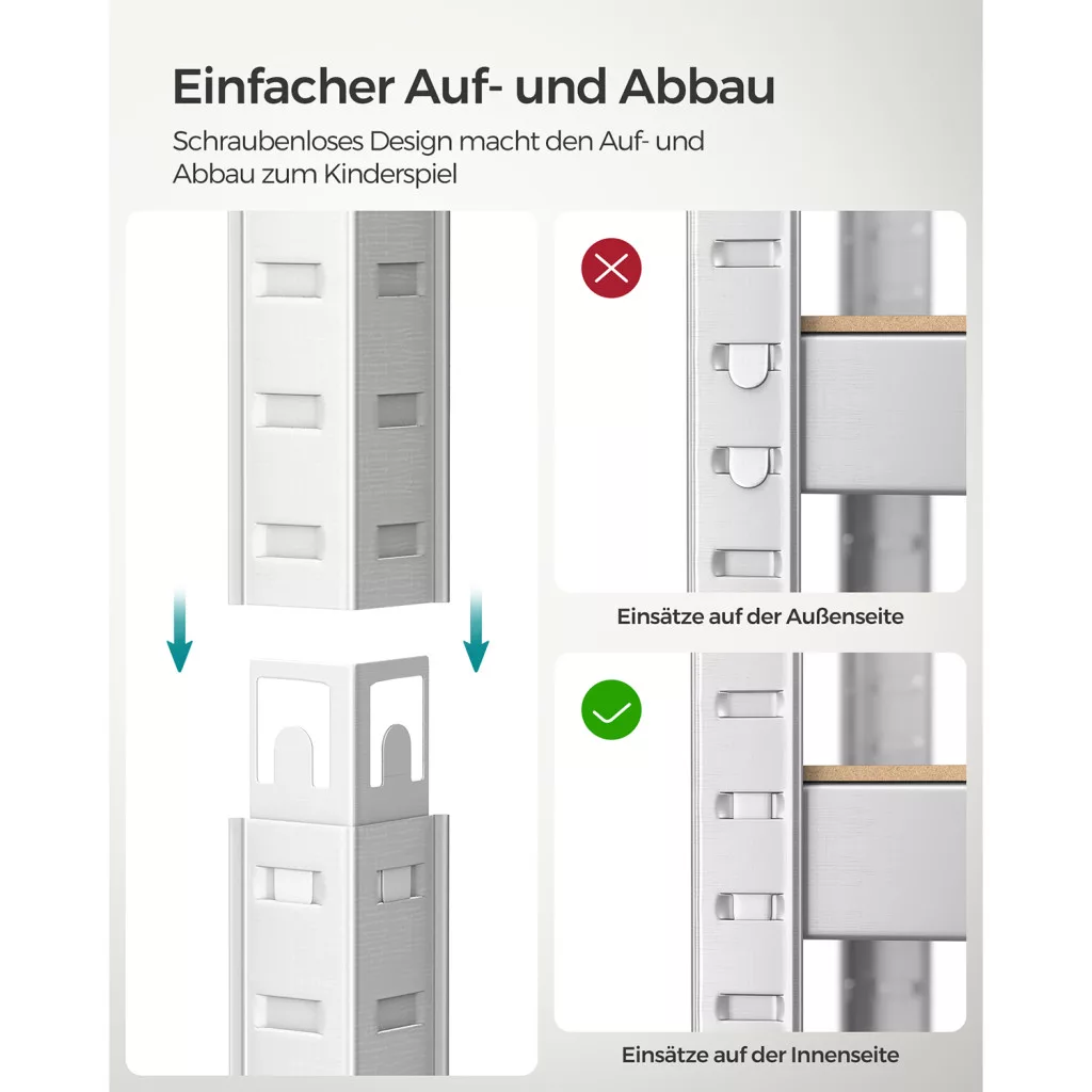 Az állvány különlegessége, hogy szerszámok nélkül, egyszerűen összeállítható, és a polcok 3 cm-enként állíthatók. A mellékelt falbillentés-gátló további biztonságot nyújt, a polcrendszer pedig igény szerint két külön egységre is bontható.