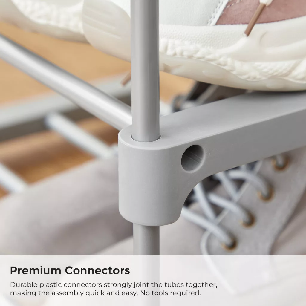 Ez az elegáns szürke fém cipőtároló állvány tökéletes megoldást kínál a rendezett otthon megteremtéséhez. A robusztus fémcsövekből készült szerkezet és a praktikus műanyag csatlakozók stabil tárolást biztosítanak, minden polc akár 5 kg terhelést is elbír.