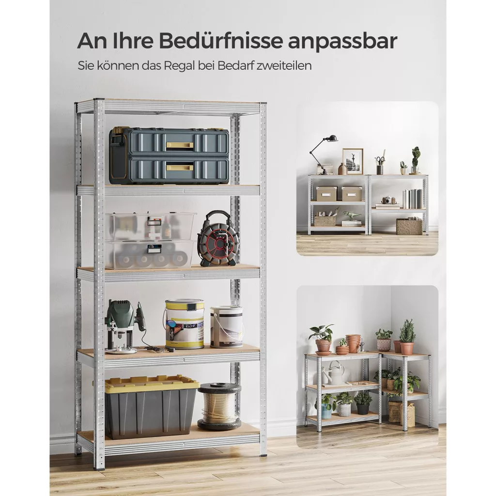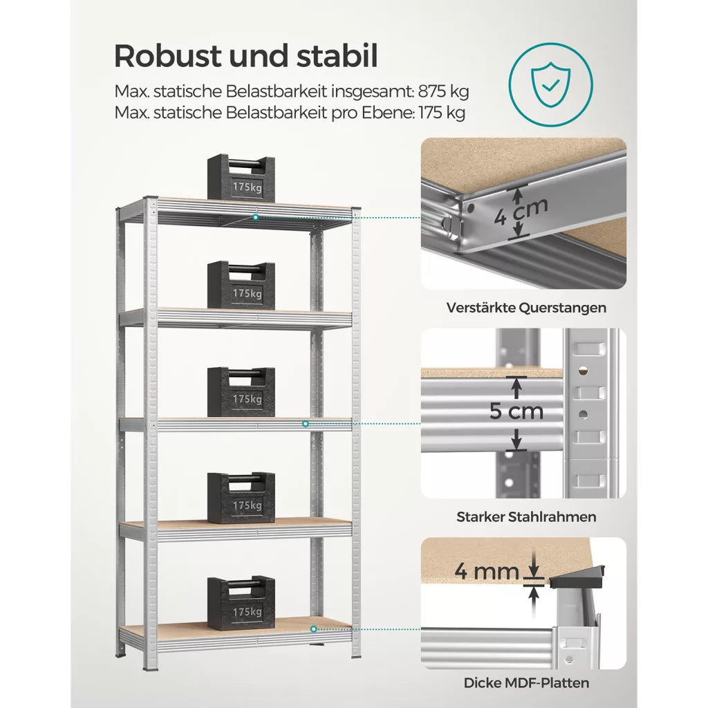 A SONGMICS 5-szintes polcrendszer a tökéletes választás mindazok számára, akik professzionális és megbízható tárolási megoldást keresnek garázsukba, műhelyükbe vagy raktárhelyiségükbe. A masszív acél keretszerkezet és az MDF polclapok kombinációja rendkívüli stabilitást és tartósságot biztosít. Minden egyes polcszint 175 kg terhelést bír el, így akár nehéz szerszámok, alkatrészek vagy tárolódobozok elhelyezésére is ideális.
