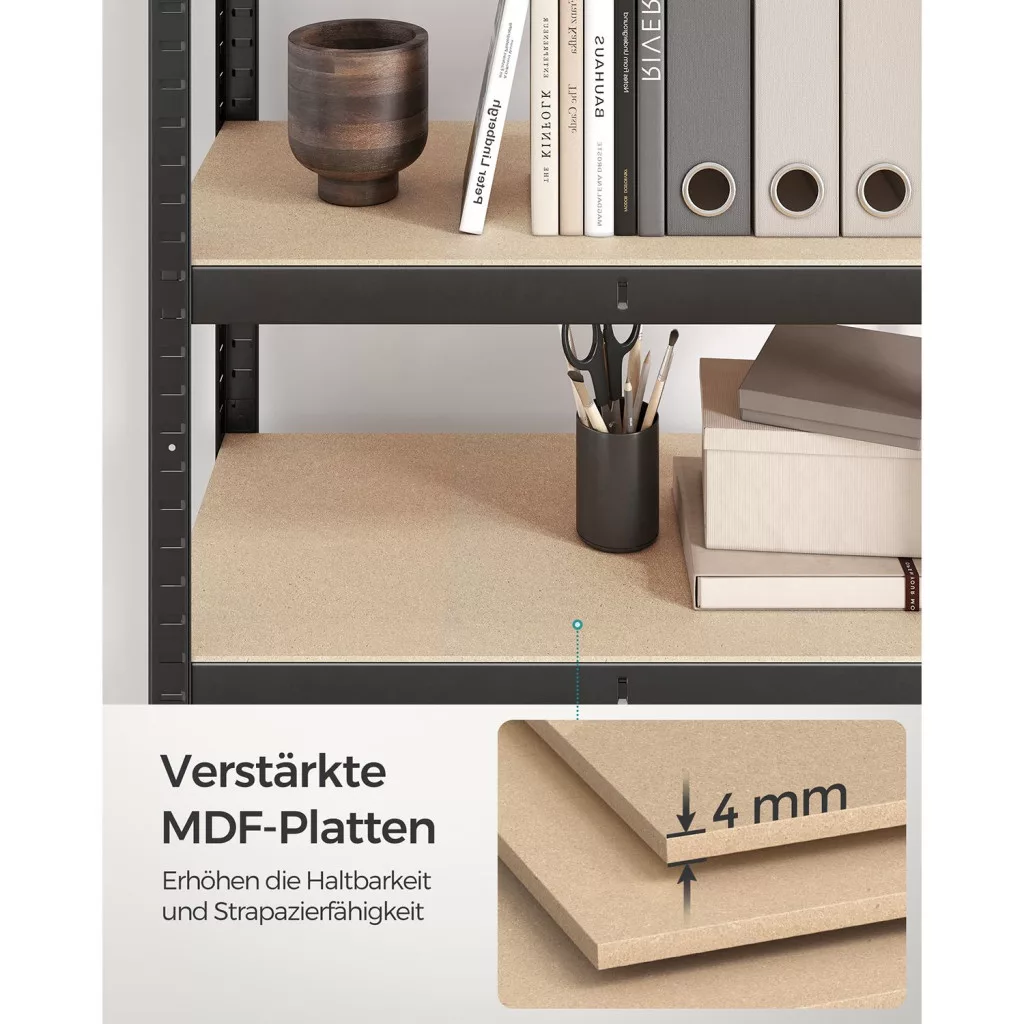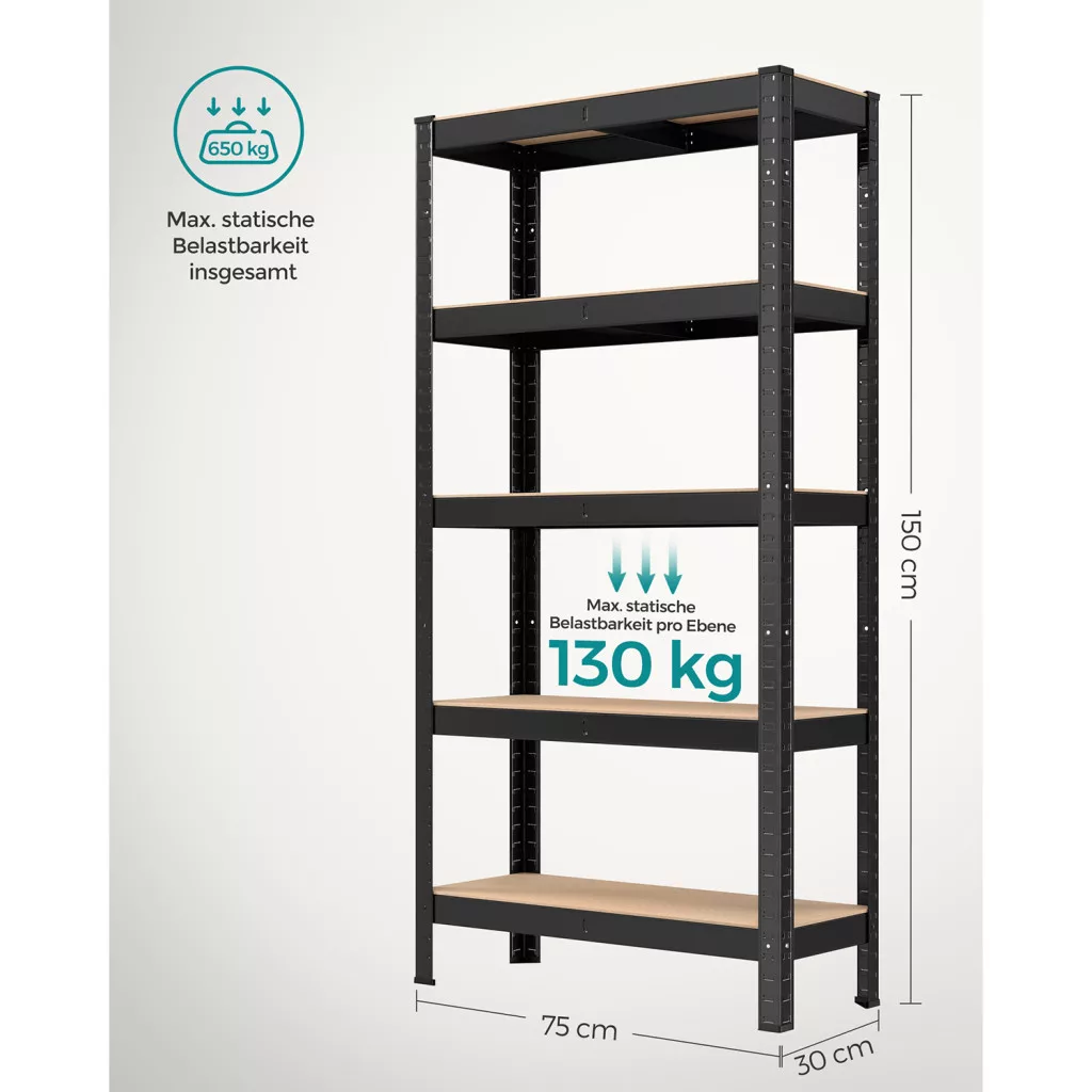A SONGMICS 5 szintes polcrendszer a stabil acél váz és az MDF polclapok kombinációjával kiváló teherbírást biztosít. Minden egyes polc akár 130 kg terhelést is elbír, így összesen 650 kg tárolására alkalmas. A csavarozás nélküli, összeilleszthető kialakításnak köszönhetően a polcrendszer percek alatt összeszerelhető, külön szerszámok nélkül. A mellékelt falirögzítő készlet extra stabilitást és biztonságot nyújt.