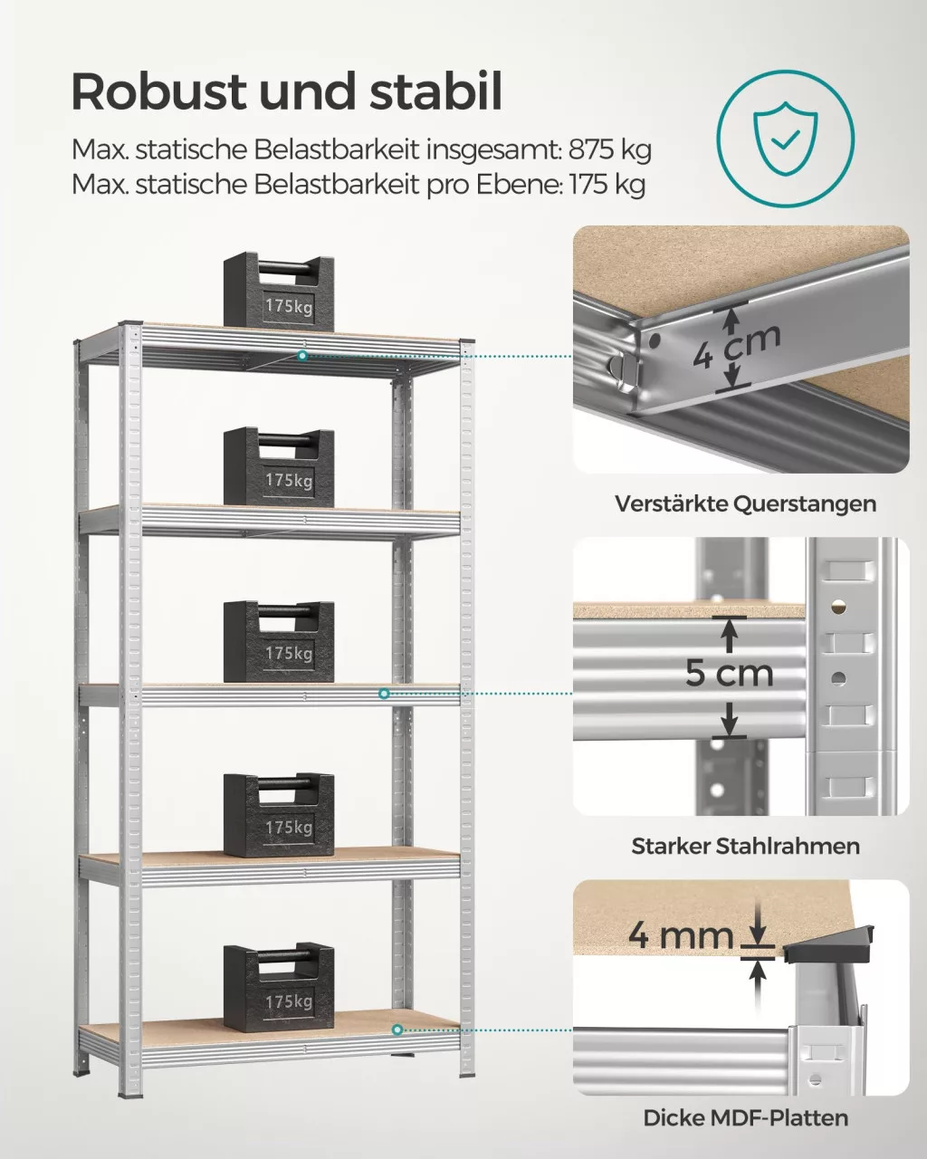 A SONGMICS 5 szintes tárolópolc a tökéletes választás mindazok számára, akik megbízható és tartós tárolási megoldást keresnek garázsukba, műhelyükbe vagy kamrájukba. A galvanizált acél váz és az E1 minőségű MDF polclapok kombinációja garantálja a hosszú élettartamot, miközben minden egyes polc akár 175 kg terhelést is elbír. A 180 cm magas, 90 cm széles konstrukció bőséges tárolófelületet biztosít szerszámok, alkatrészek, dobozok és egyéb kellékek számára.