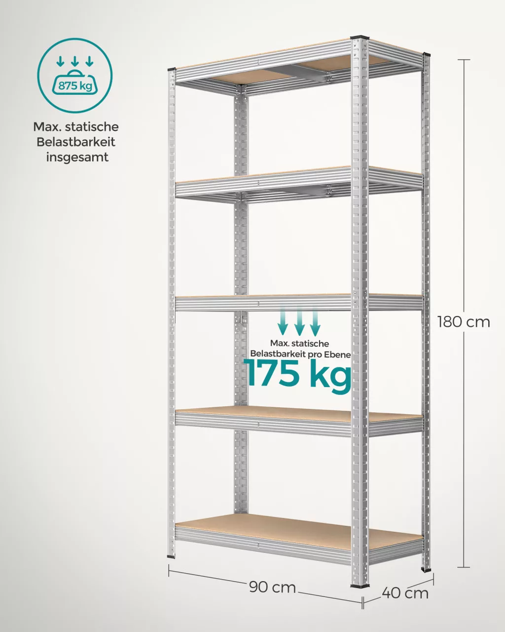 SONGMICS 5 szintes acél tárolópolc MDF polclapokkal ezüst 40 x 90 x 180 cm szerszám nélküli összeszerelés