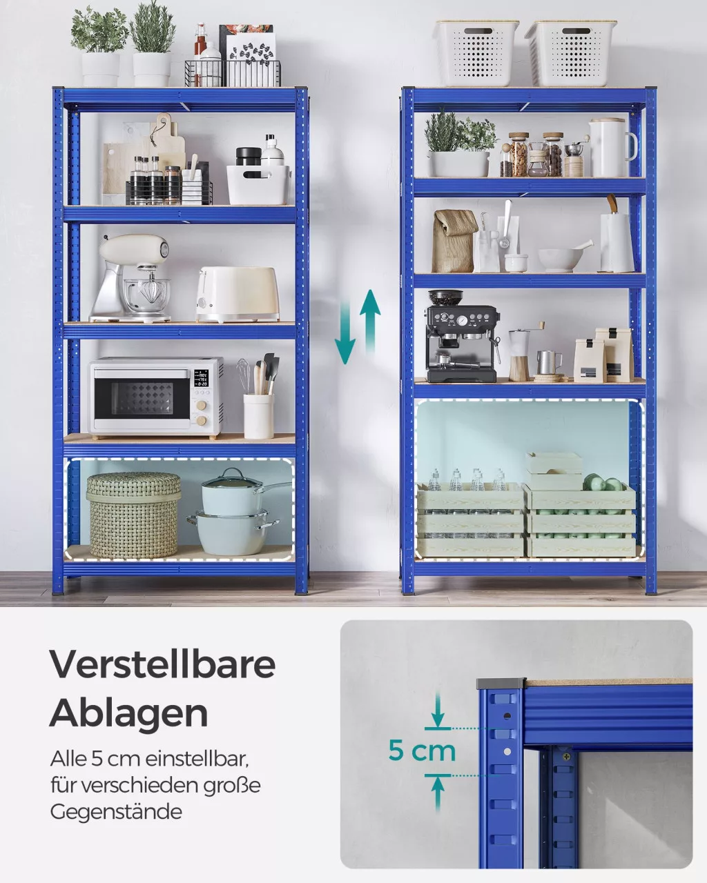 A SONGMICS 5 szintes tárolópolc a tökéletes választás mindazok számára, akik megbízható és strapabíró tárolási megoldást keresnek garázsukba, műhelyükbe vagy raktárukba. A masszív acél keret és az MDF polclapok kombinációja garantálja a hosszú élettartamot, miközben minden egyes szint akár 175 kg terhet is elbír. A kék színű polcrendszer nem csak funkcionális, de vizuálisan is vonzó megjelenést kölcsönöz a tároló térnek.