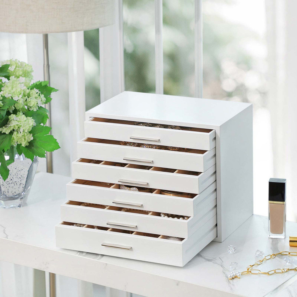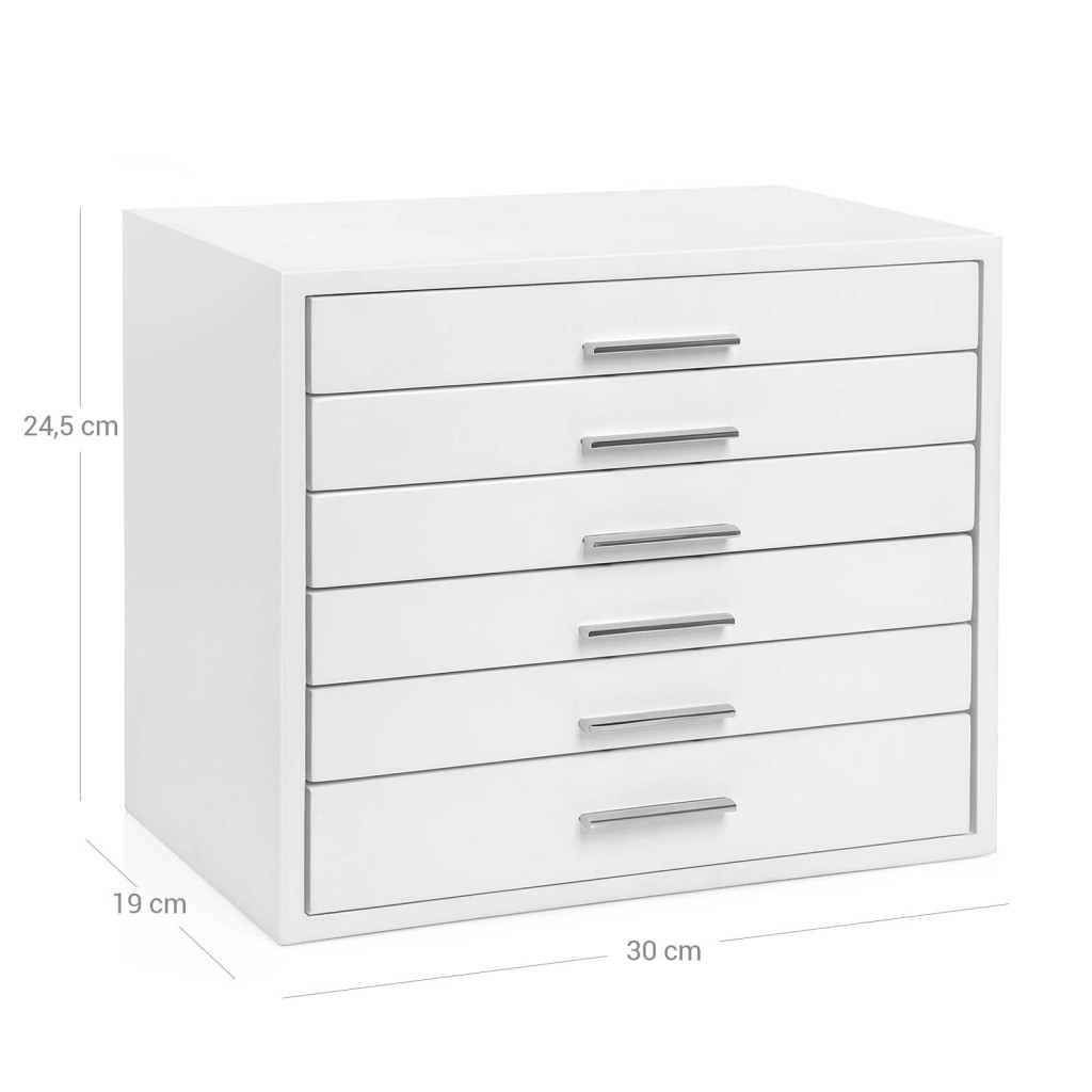 Elegáns, 6 fiókos fehér ékszertartó szekrény bársony béléssel, amely tökéletes megoldást nyújt minden ékszer rendszerezett tárolására.