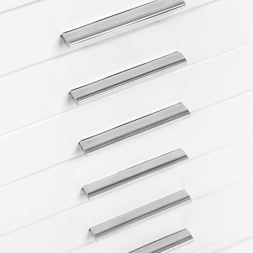 A minimalista design és a króm fogantyúk modern eleganciát kölcsönöznek a bútordarabnak, amely tökéletesen illeszkedik bármilyen lakberendezési stílushoz. A fiókos kialakítás könnyű hozzáférést biztosít minden ékszerhez, miközben megóvja azokat a portól és a károsodástól.