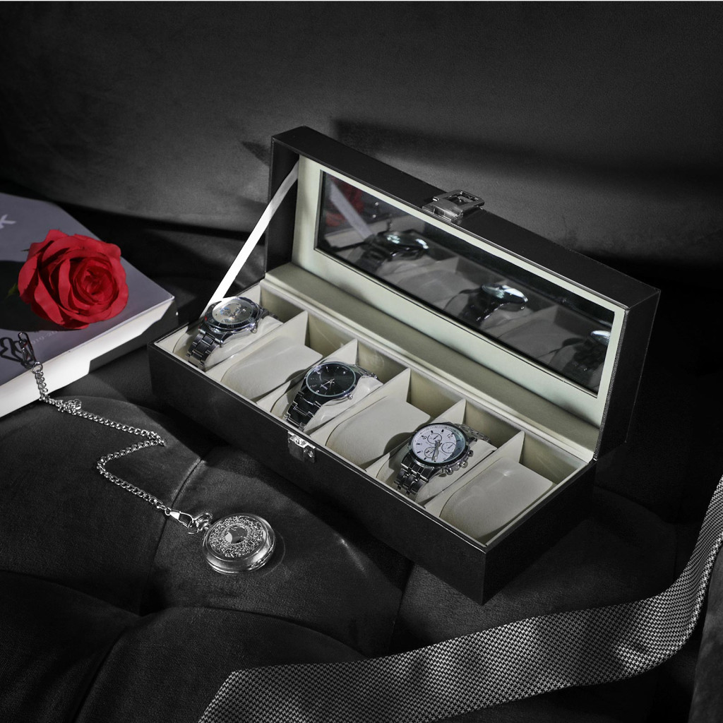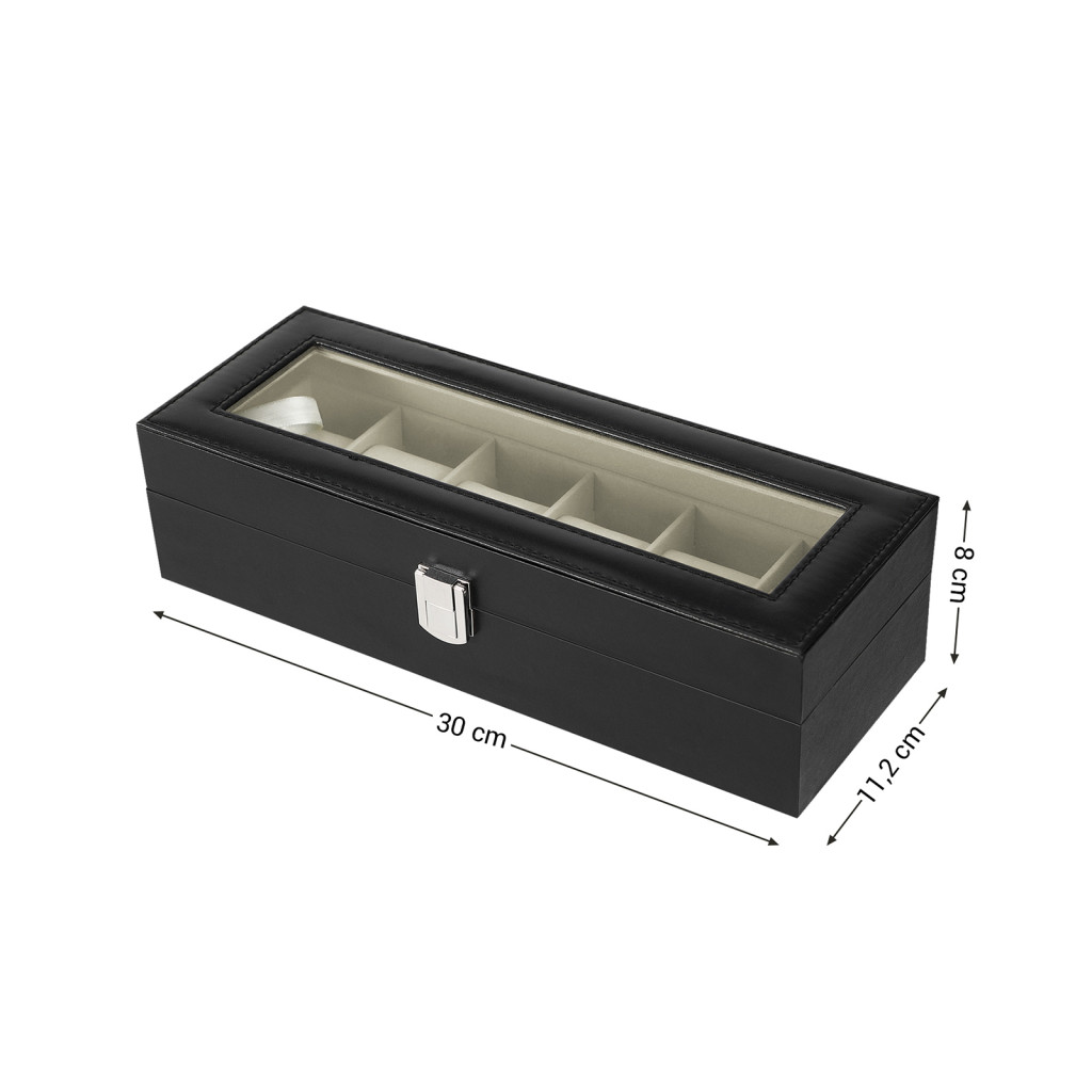 A doboz 6 különálló rekeszében akár 48 mm-es számlap átmérőjű órák is kényelmesen elférnek. A strapabíró fém csattal ellátott fedél megbízhatóan védi az órákat a portól, ugyanakkor az üvegfelületen keresztül könnyedén áttekinthető a kollekció.