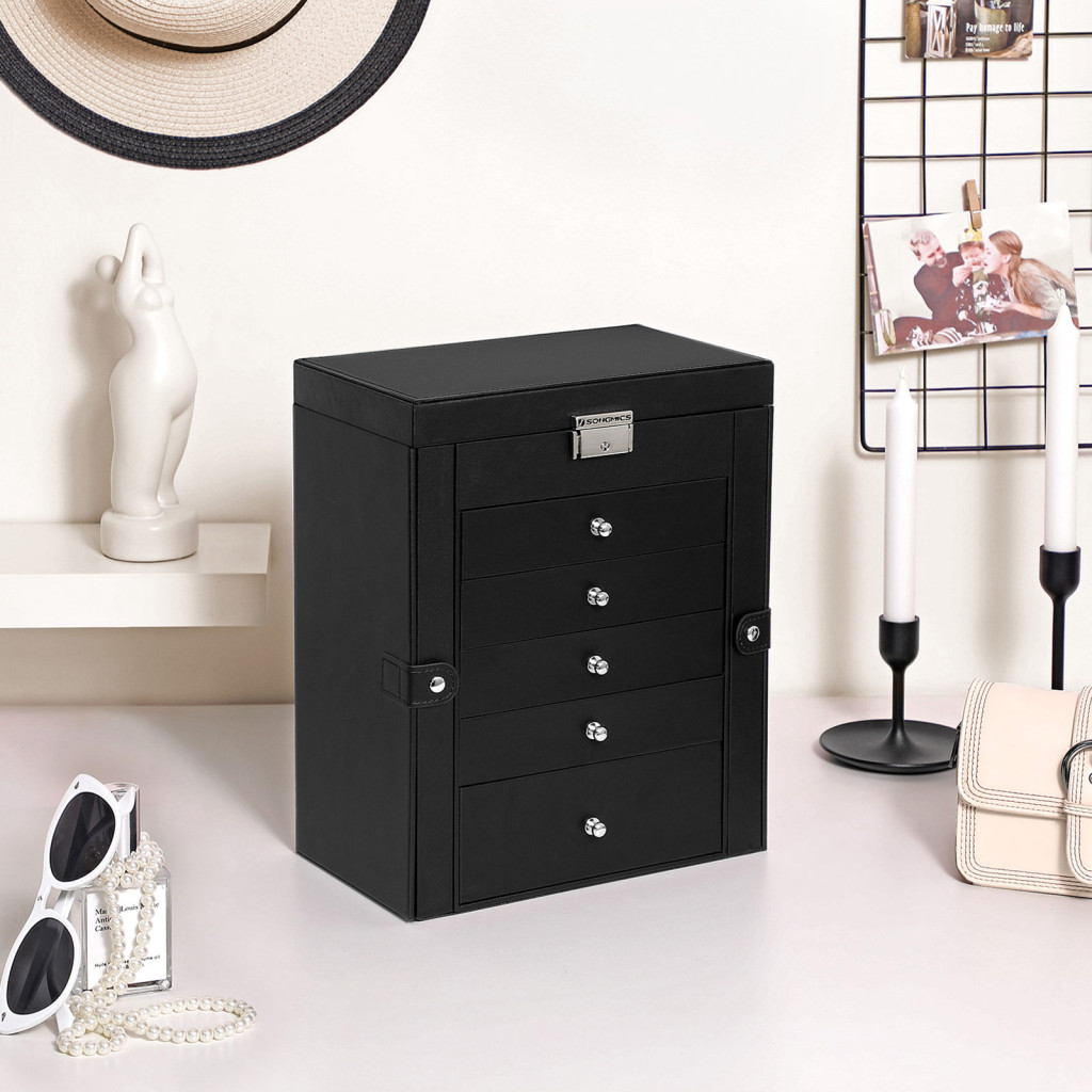 SONGMICS 6 Szintes Ékszertartó Doboz Tükörrel Fekete
