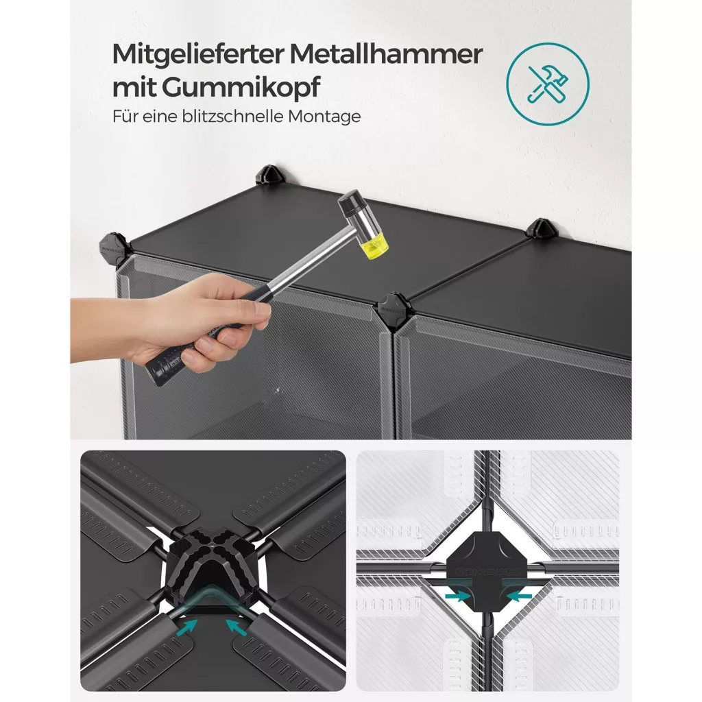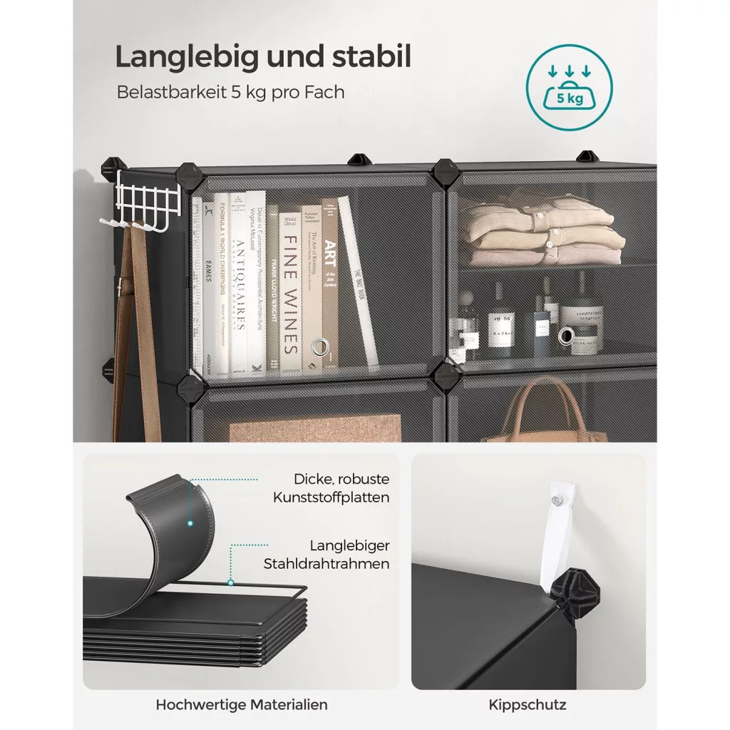 A stabil acélvázas konstrukció és a minőségi műanyag panelek tartós és megbízható tárolást garantálnak. Minden rekesz 5 kg terhelést bír el, így akár nehezebb cipők vagy táskák tárolására is használhatja. Az oldalsó akasztók praktikus helyet biztosítanak kalapok, kutyapórázok vagy táskák számára. A mellékelt gumikaláccsal a szerelés gyors és egyszerű, ráadásul a szekrény könnyen szétszerelhető és áthelyezhető. A falra rögzíthető biztonsági készlet extra stabilitást nyújt, így akár gyerekszobában is biztonságosan használható.