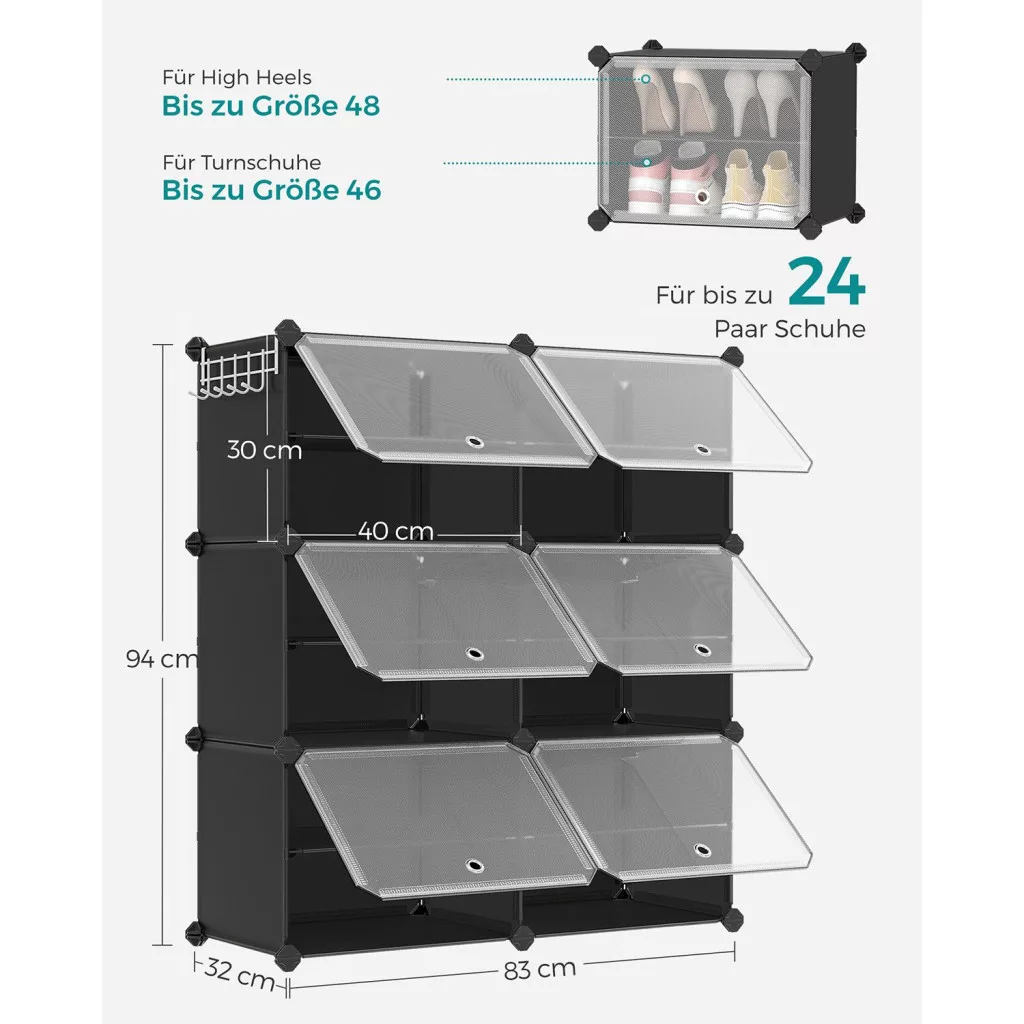 • Akár 24 pár cipő tárolása: A 6 tágas rekesz bőséges helyet biztosít cipőinek, táskáinak és ruházatának, miközben az oldalsó akasztók további tárolási lehetőséget kínálnak kisebb kiegészítők számára.