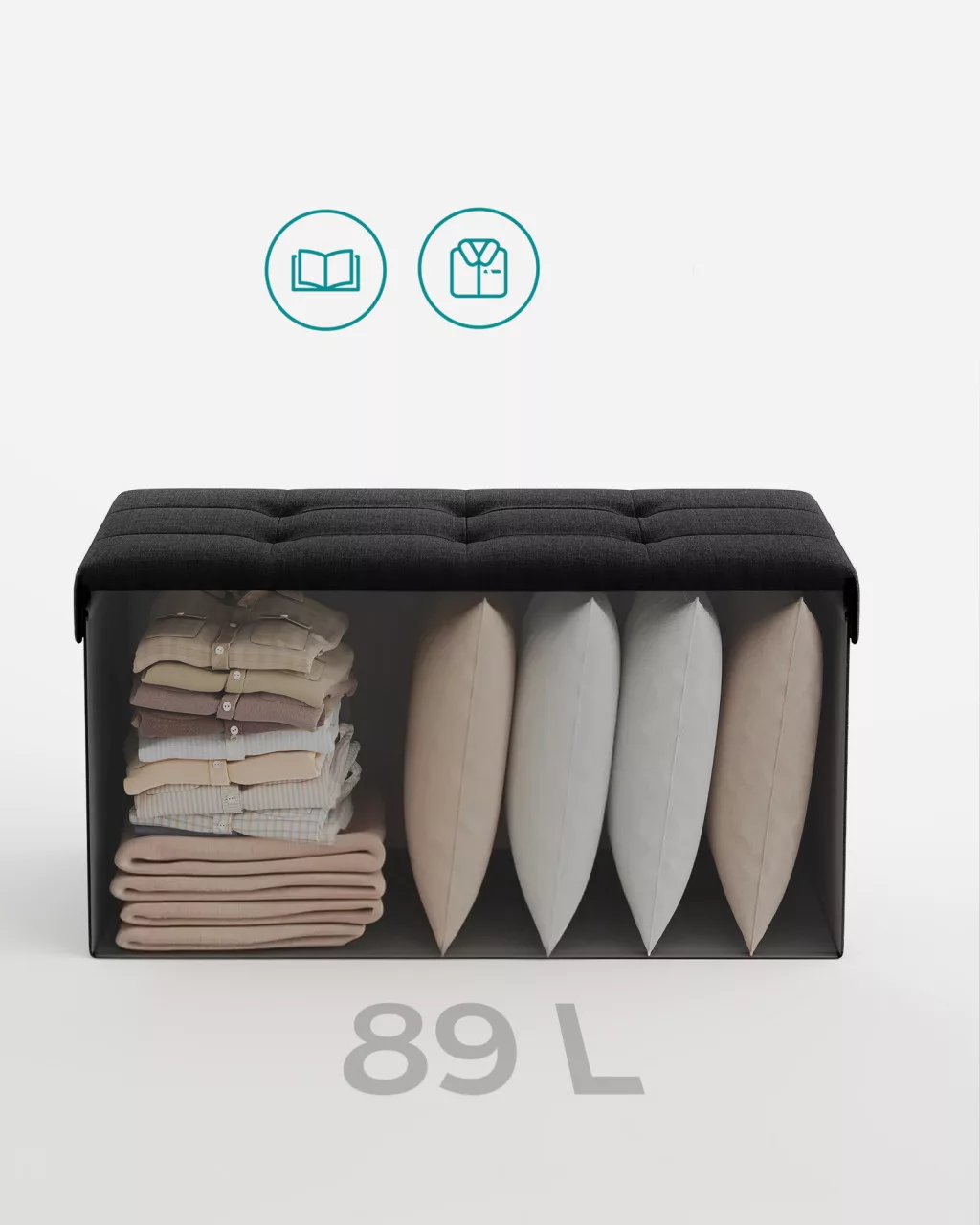 A SONGMICS összecsukható tároló ülőpad a funkcionalitás és az elegancia tökéletes ötvözete. A 76 cm hosszú, fekete színű bútor vászonszerű felületével és steppelt dizájnjával modern eleganciát kölcsönöz bármely helyiségnek. A 89 literes tárolótér ideális ágyneműk, párnák, takarók és magazinok rendezett elhelyezésére, miközben a masszív MDF konstrukció és a fém sarokvédők akár 300 kg terhelést is elbírnak.