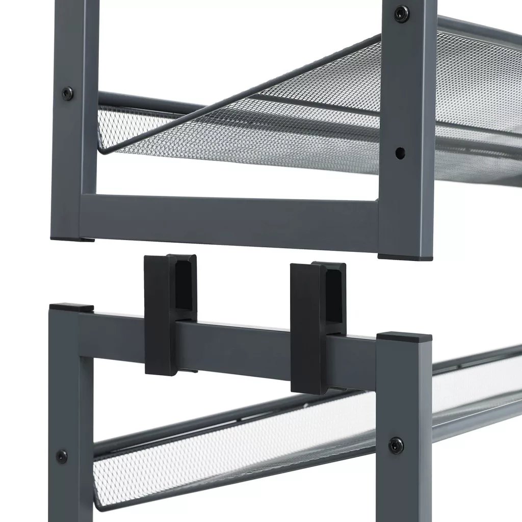 Sokoldalú, stabil cipőtároló rendszer két összekapcsolható 4-szintes egységgel, állítható polcmagassággal és modern szürke kivitelben.