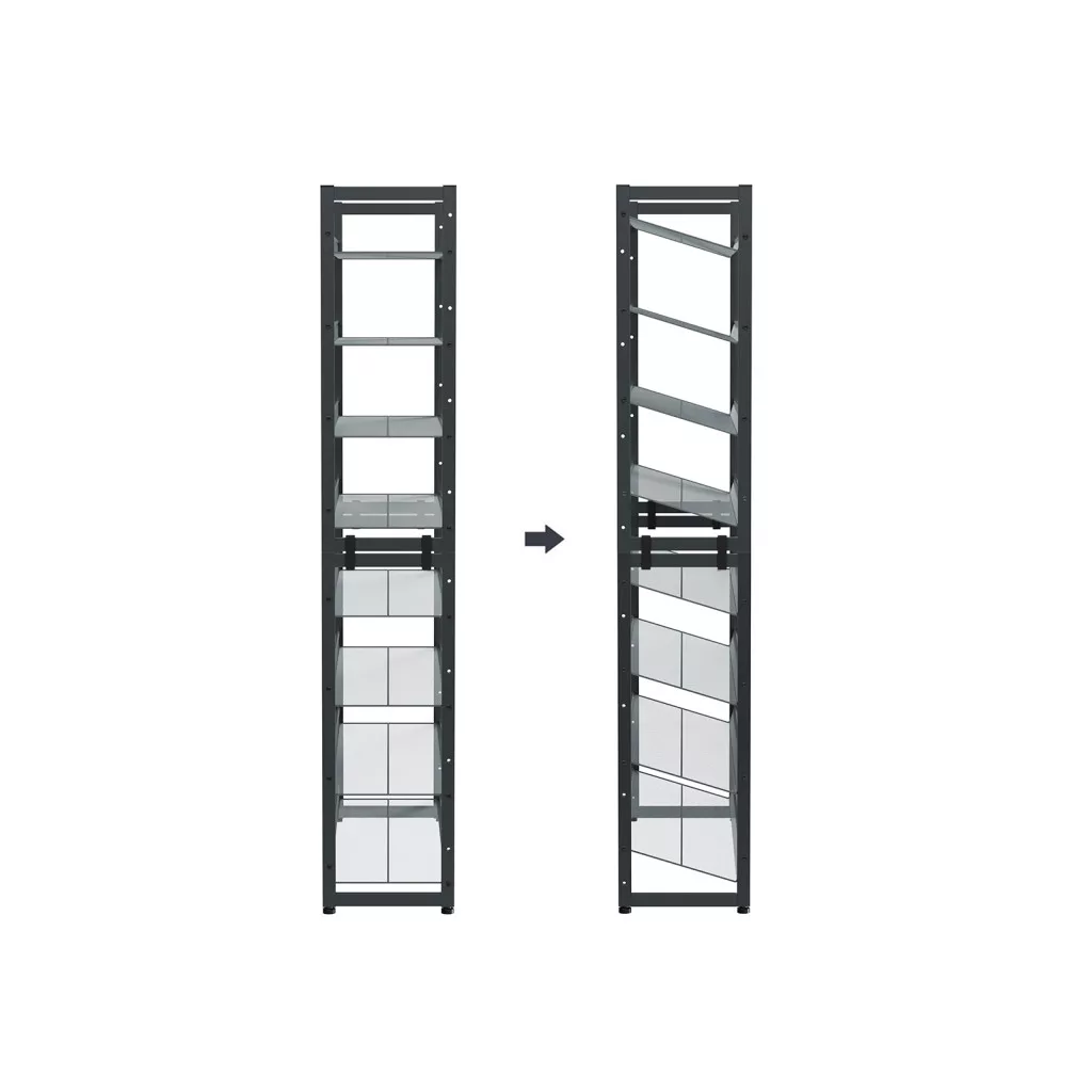 Ez a praktikus cipőtároló rendszer tökéletes megoldást nyújt a rendezett otthon kialakításához. A két különálló egység használható együtt nyolcszintes állványként, vagy külön-külön különböző helyiségekben. A stabil acélhálós polcok lapos vagy döntött pozícióban is beállíthatók, így minden cipőtípus könnyen áttekinthető és hozzáférhető.