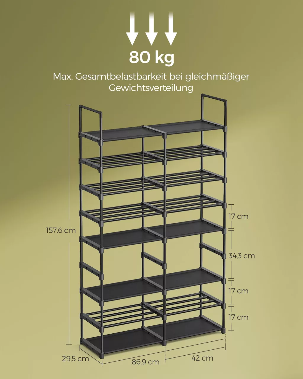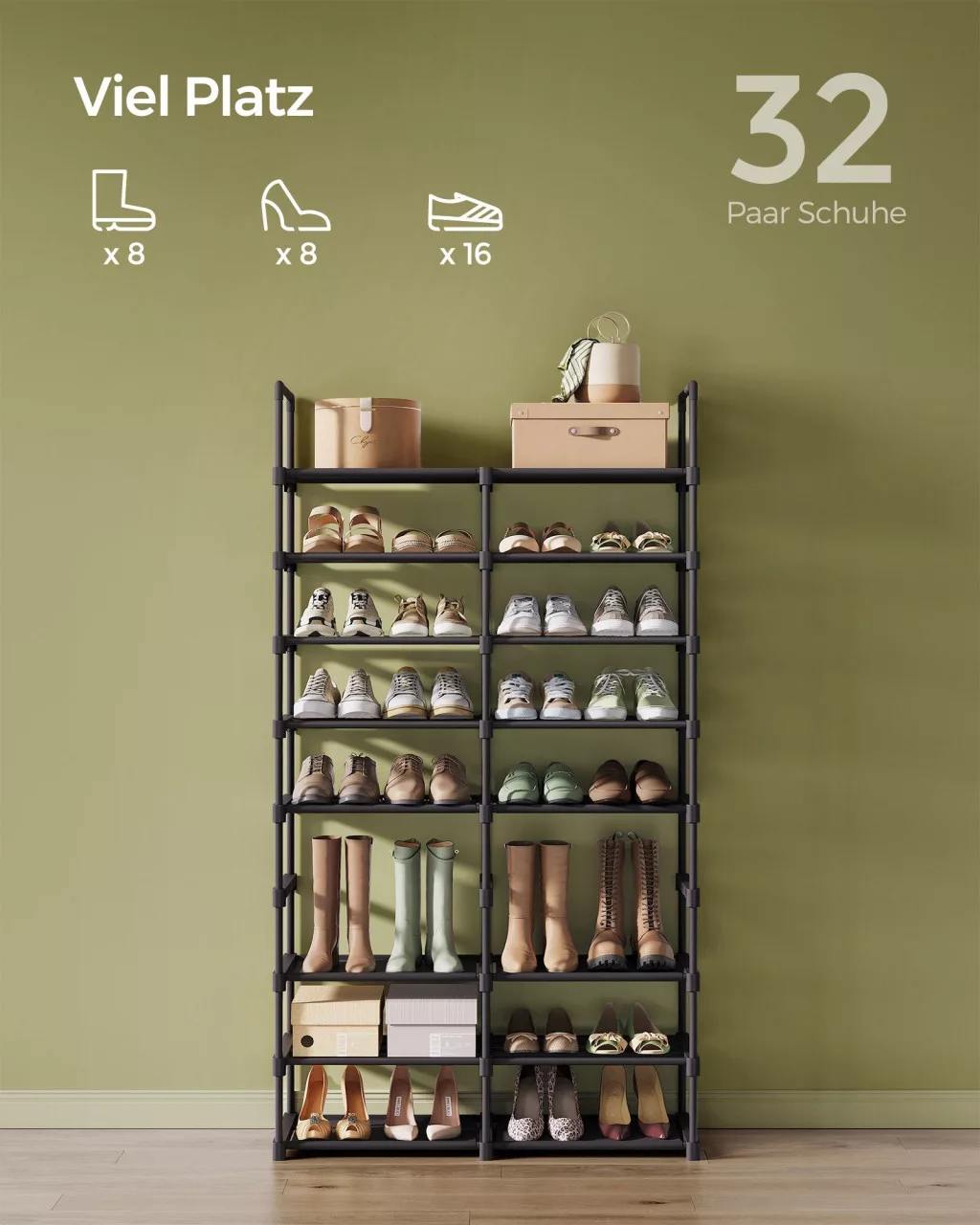 Ez a praktikus cipőtároló állvány tökéletes megoldást nyújt a rendezett otthon kialakításához. A 8 szintes polcrendszer rugalmasan alakítható az Ön igényeinek megfelelően, így magas szárú csizmák és lapos cipők egyaránt kényelmesen tárolhatók rajta.