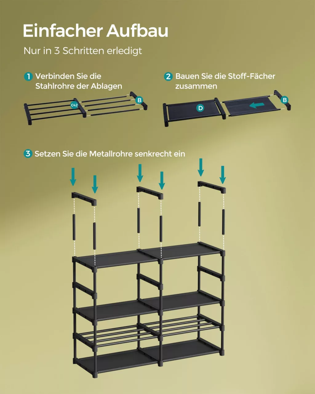 A stabil acélváz és a tartós nemszőtt textil polcok kombinációja nem csak esztétikus megjelenést, de hosszú élettartamot is biztosít. Az állvány könnyen összeszerelhető és átrendezhető, így tökéletes választás gardróbokba, előszobákba vagy akár garázsokba is.