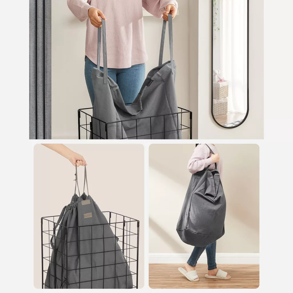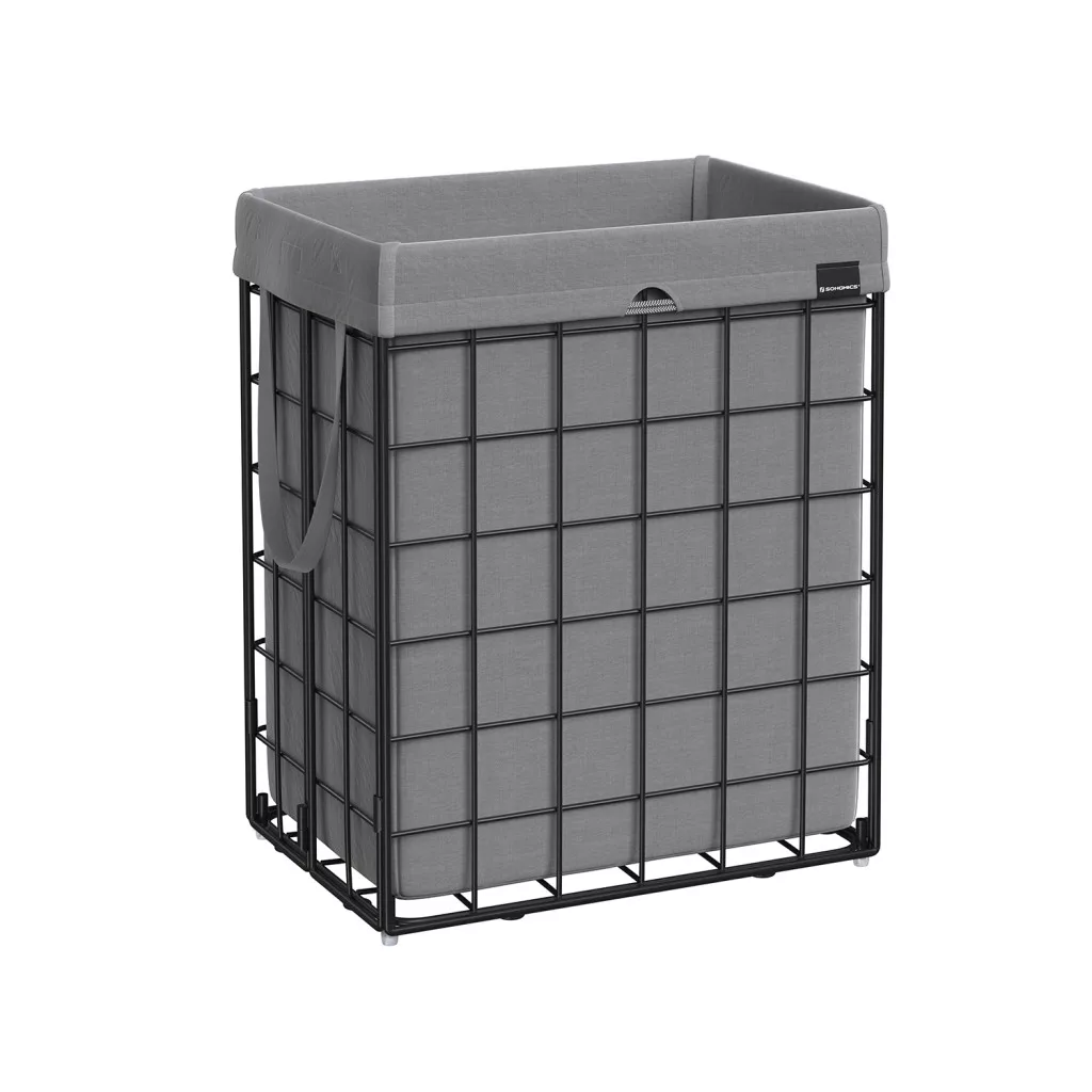 Strapabíró, 90 literes szennyestartó kosár levehető és mosható zsákkal, erős fémvázas kialakítással a praktikus ruhatárolásért.